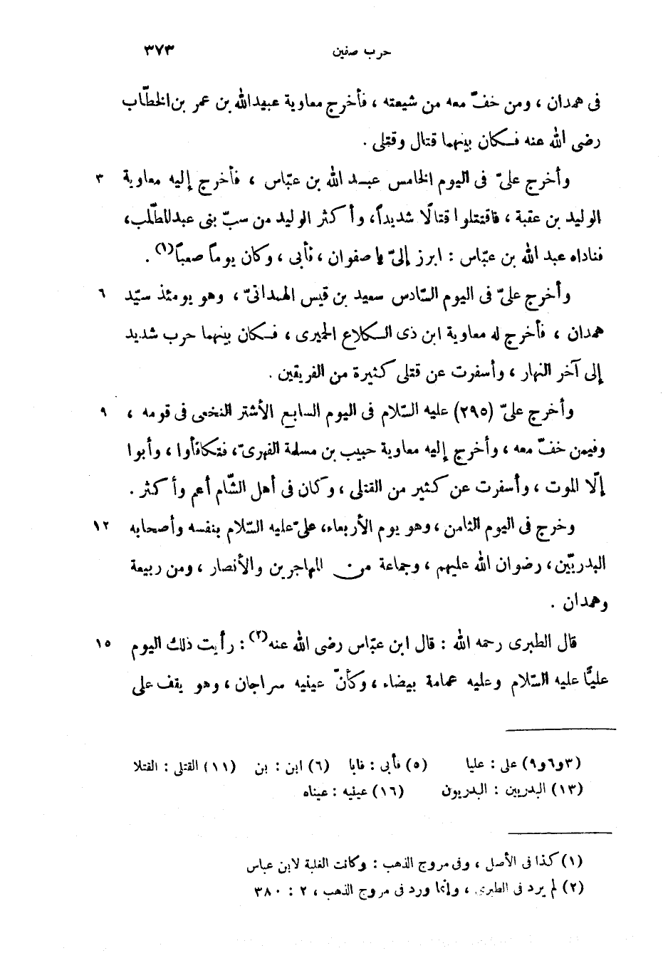 وأخرج علىّ فى اليوم الخامس عبد الله بن عبّاس، فأخرج إليه معاوية الوليد بن عقبة، فاقتتلوا قتالا شديدا، وأكثر الوليد من سبّ بنى عبد المطّلب، فناداه عبد الله بن عبّاس: ابرز إلىّ يا صفوان، فأبى، وكان يوما صعبا (1).