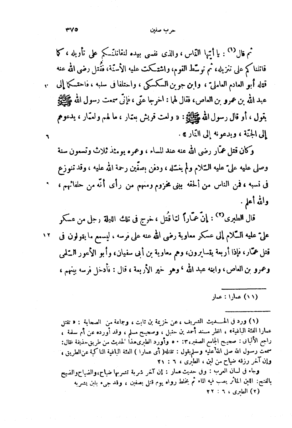 ثم قال (1): يا أيّها النّاس، والذى نفسى بيده لنقاتلنّكم على تأويله، كما قاتلناكم على تنزيله، ثم توسّط القوم، واشتكت عليه الأستّة، فقتل رضى الله عنه قتله أبو العادم العاملىّ، وابن جوين السكسكى، واختلفا فى سلبه، فاحتكما إلى عبد الله بن عمرو بن العاص، فقال لهما: اخرجا عنّى، فإنّى سمعت رسول الله صلّى الله عليه وسلم يقول، أو قال رسول الله صلّى الله عليه وسلم: «ولعت قريش بعمّار، ما لهم ولعمّار، يدعوهم إلى الجنّة، ويدعونه إلى النّار».