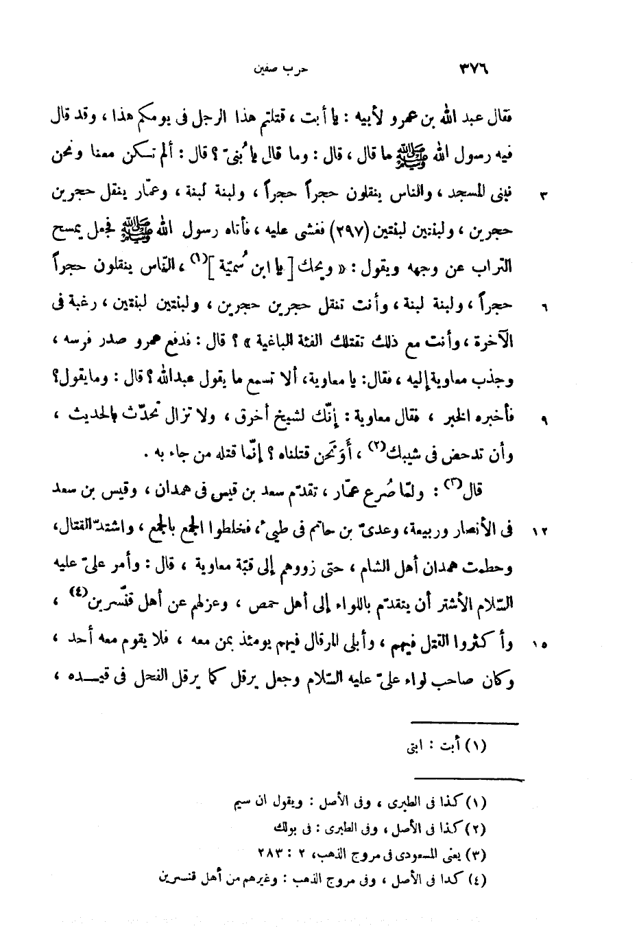 فقال عبد الله بن عمرو لأبيه: يا أبت، قتلتم هذا الرجل فى يومكم هذا، وقد قال فيه رسول الله صلّى الله عليه وسلم ما قال، قال: وما قال يا بنىّ؟ قال: ألم تكن معنا ونحن نبنى المسجد، والناس ينقلون حجرا حجرا، ولبنة لبنة، وعمّار ينقل حجرين حجرين، ولبنتين لبنتين (297) فغشى عليه، فأتاه رسول الله صلّى الله عليه وسلم فجعل يمسح التراب عن وجهه ويقول: «ويحك [يا ابن سميّة] (1)، النّاس ينقلون حجرا حجرا، ولبنة لبنة، وأنت تنقل حجرين حجرين، ولبنتين لبنتين، رغبة فى الآخرة، وأنت مع ذلك تقتلك الفئة الفئة الباغية»؟ قال: فدفع عمرو صدر فرسه، وجذب معاوية إليه، فقال: يا معاوية، ألا تسمع ما يقول عبد الله؟ قال: وما يقول؟ فأخبره الخبر، فقال معاوية: إنّك لشيخ أخرق، ولا تزال تحدّث بالحديث، وأن تدحض فى شيبك (2)، أونحن قتلناه؟ إنّما قتله من جاء به.