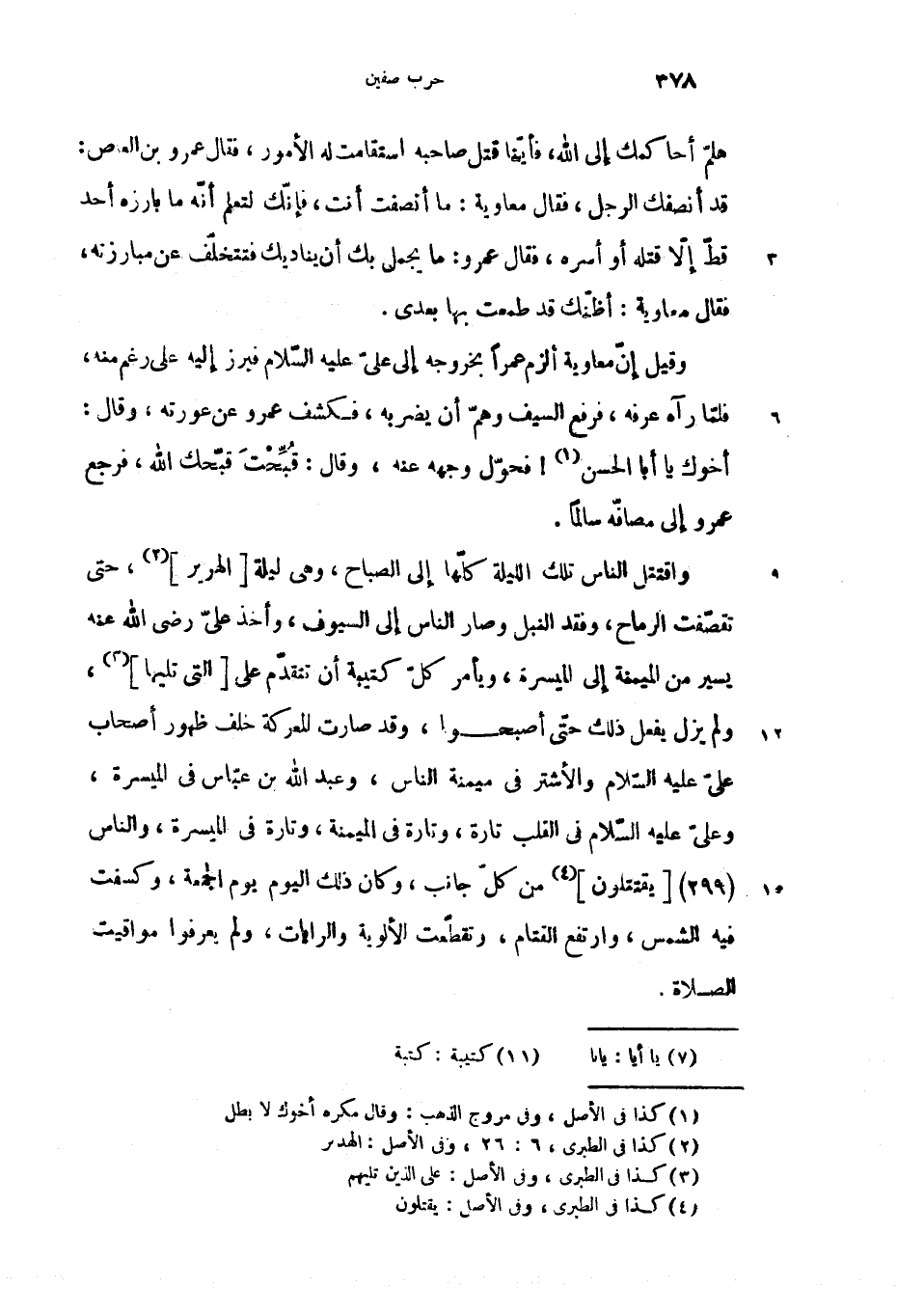 واقتتل الناس تلك الليلة كلّها إلى الصباح، وهى ليلة [الهرير] (2)، حتى تقصّفت الرماح، وفقد النبل وصار الناس إلى السيوف، وأخذ علىّ رضى الله عنه يسير من الميمنة إلى الميسرة، ويأمر كلّ كتيبة أن تتقدّم على [التى تليها] (3)، ولم يزل يفعل ذلك حتّى أصبحوا، وقد صارت المعركة خلف ظهور أصحاب علىّ عليه السّلام والأشتر فى ميمنة الناس، وعبد الله بن عبّاس فى الميسرة، وعلىّ عليه السّلام فى القلب تارة، وتارة فى الميمنة، وتارة فى الميسرة، والناس (299) [يقتتلون] (4) من كلّ جانب، وكان ذلك اليوم يوم الجمعة، وكسفت فيه الشمس، وارتفع القتام، وتقطّعت الألوية والرايات، ولم يعرفوا مواقيت الصلاة.