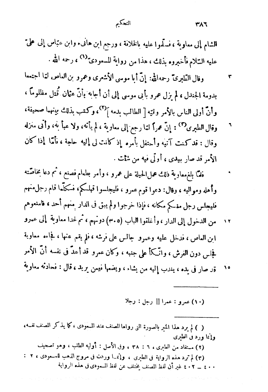 وقال الطّبرىّ رحمه الله: إنّ أبا موسى الأشعرى وعمرو بن العاص لمّا اجتمعا بدومة الجندل، لم يزل عمرو بأبى موسى إلى أن أجابه بأنّ عثمان قتل مظلوما، وأنّ أولى الناس بالأمر وليّه [الطالب بدمه] (2)، وكتب بذلك بينهما صحيفة، وقال الطبرى (3): إنّ عمرا لمّا رجع إلى معاوية، لم يأته، ولا عبأ به، وأتى منزله وقال: قد كنت آتيه وأحتفل بأمره إذ كانت لى إليه حاجة، فأمّا إذا كان الأمر قد صار بيدى، أولّى فيه من شئت.