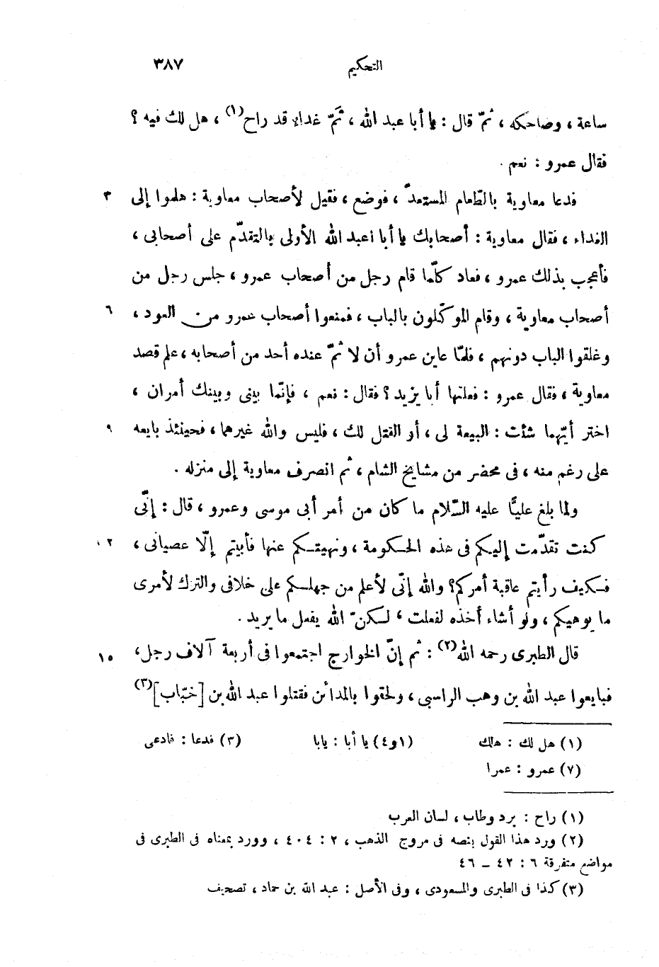فدعا معاوية بالطّعام المستعدّ، فوضع، فقيل لأصحاب معاوية: هلموا إلى الغداء، فقال معاوية: أصحابك يا أبا عبد الله الأولى بالتقدّم على أصحابى، فأعجب بذلك عمرو، فعاد كلّما قام رجل من أصحاب عمرو، جلس رجل من أصحاب معاوية، وقام الموكّلون بالباب، فمنعوا أصحاب عمرو من العود، وغلقوا الباب دونهم، فلمّا عاين عمرو أن لا ثمّ عنده أحد من أصحابه، علم قصد معاوية، فقال عمرو: فعلتها أبا يزيد؟ فقال: نعم، فإنّما بينى وبينك أمران، اختر أيّهما شئت: البيعة لى، أو القتل لك، فليس والله غيرهما، فحينئذ بايعه على رغم منه، فى محضر من مشايخ الشام، ثم انصرف معاوية إلى منزله.
