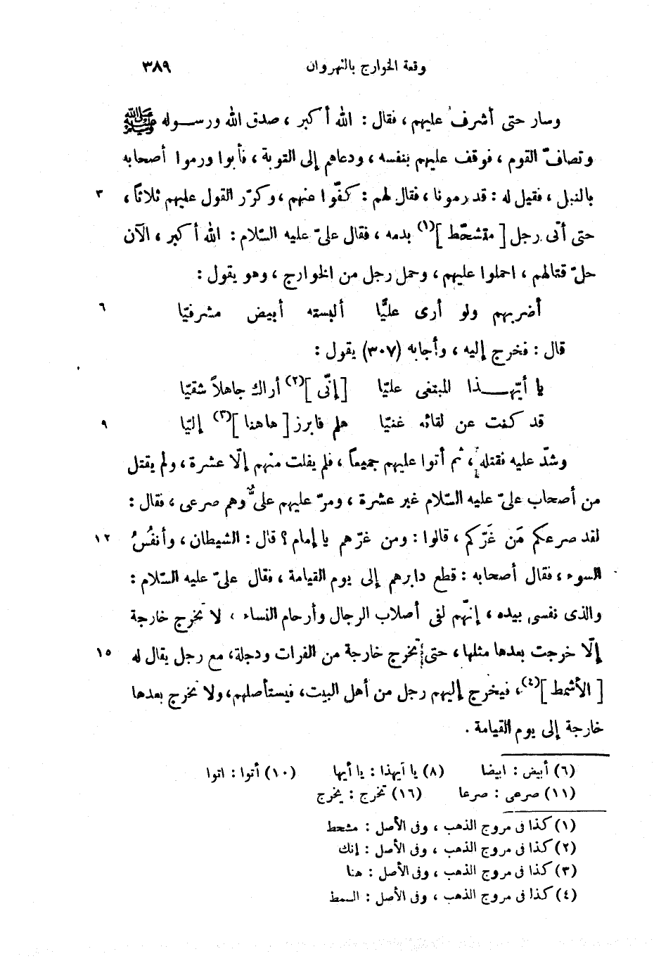 وسار حتى أشرف عليهم، فقال: الله أكبر، صدق الله ورسوله صلّى الله عليه وسلم وتصافّ القوم، فوقف عليهم بنفسه، ودعاهم إلى التوبة، فأبوا ورموا أصحابه بالنبل، فقيل له: قد رمونا، فقال لهم: كفّوا عنهم، وكرّر القول عليهم ثلاثا، حتى أتى رجل [متشحّط] (1) بدمه، فقال علىّ عليه السّلام: الله أكبر، الآن حلّ قتالهم، احملوا عليهم، وحمل رجل من الخوارج، وهو يقول: