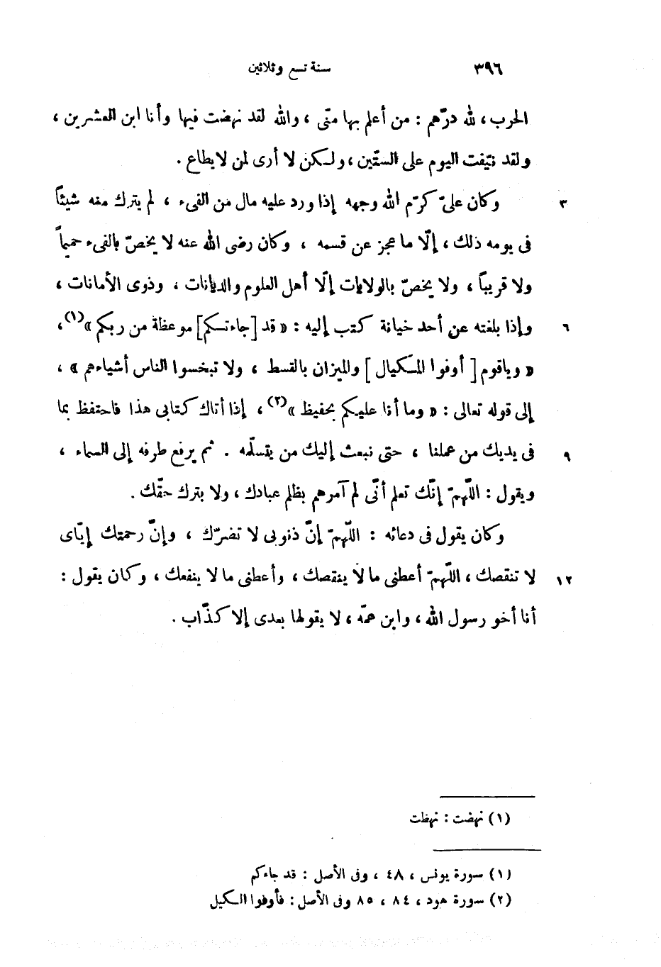 وكان علىّ كرّم الله وجهه إذا ورد عليه مال من الفئ، لم يترك منه شيئا فى يومه ذلك، إلاّ ما عجز عن قسمه، وكان رضى الله عنه لا يخصّ بالفئ حميما ولا قريبا، ولا يخصّ بالولايات إلاّ أهل العلوم والديانات، وذوى الأمانات، وإذا بلغته عن أحد خيانة كتب إليه: {قَدْ [جاءَتْكُمْ] مَوْعِظَةٌ مِنْ رَبِّكُمْ»} (1)، {وَيا قَوْمِ [أَوْفُوا الْمِكْيالَ] وَالْمِيزانَ بِالْقِسْطِ، وَلا تَبْخَسُوا النّاسَ أَشْياءَهُمْ»}، إلى قوله تعالى: {وَما أَنَا عَلَيْكُمْ بِحَفِيظٍ»} (2)، إذا أتاك كتابى هذا فاحتفظ بما فى يديك من عملنا، حتى نبعث إليك من يتسلّمه. ثم يرفع طرفه إلى السماء، ويقول: اللهمّ إنّك تعلم أنّى لم آمرهم بظلم عبادك، ولا بترك حقّك.