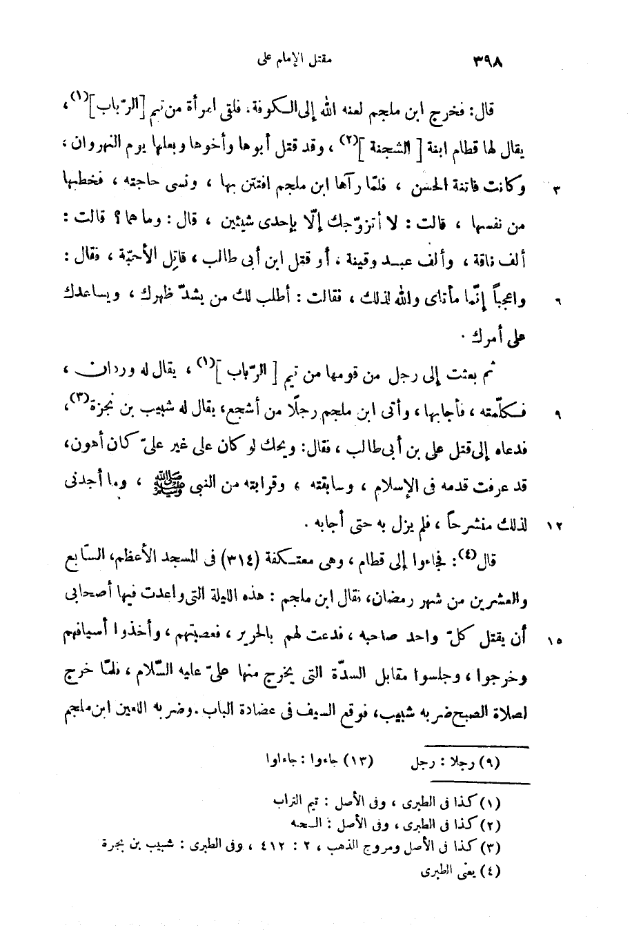 قال (4): فجاءوا إلى قطام، وهى معتكفة (314) فى المسجد الأعظم، السّابع والعشرين من شهر رمضان، فقال ابن ملجم: هذه الليلة التى واعدت فيها أصحابى أن يقتل كلّ واحد صاحبه، فدعت لهم بالحرير، فعصبتهم، وأخذوا أسيافهم وخرجوا، وجلسوا مقابل السدّة التى يخرج منها علىّ عليه السّلام، فلمّا خرج لصلاة الصبح ضربه شبيب، فوقع السيف فى عضادة الباب، وضربه اللعين ابن ملجم
