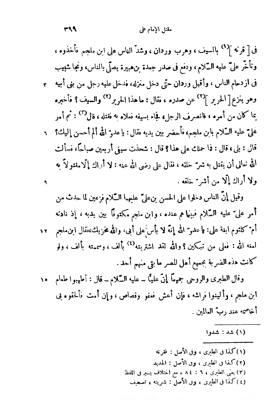 وقال الطبرى والروحى جميعا إنّ عليّا-عليه السّلام-قال: أطيبوا طعام ابن ملجم، وألينوا فراشه، فإن أعش فعفو وقصاص، وإن أمت فألحقوه بى أخاصمه عند ربّ العالمين.
