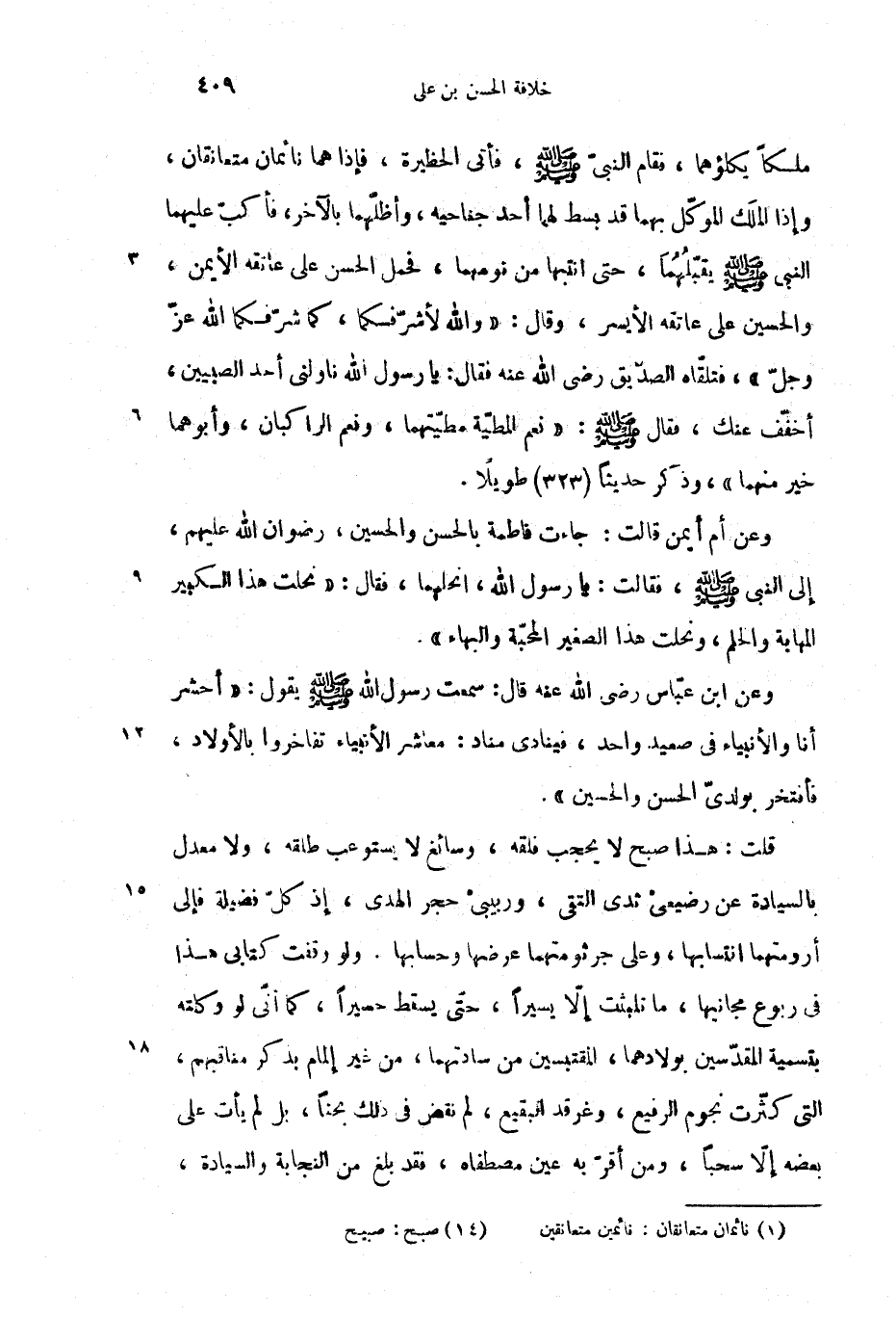 قلت: هذا صبح لا يحجب فلقه، وسائغ لا يستوعب طلقه، ولا معدل بالسيادة عن رضيعى ثدى التقى، وربيبى حجر الهدى، إذ كلّ فضيلة فإلى أرومتهما انتسابها، وعلى جرثومتهما عرضها وحسابها. ولو وقفت كتابى هذا فى ربوع مجانيها، ما تلبثت إلاّ يسيرا، حتّى يسقط حسيرا، كما أنّى لو وكلته بتسمية المقدّسين بولادهما، المقتبسين من سادتهما، من غير إلمام بذكر مناقبهم، التى كثّرت بحوم الرفيع، وغرقد البقيع، لم نقض فى ذلك بحثا، بل لم يأت على بعضه إلاّ سحبا، ومن أقرّ به عين مصطفاه، فقد بلغ من النجابة والسيادة،