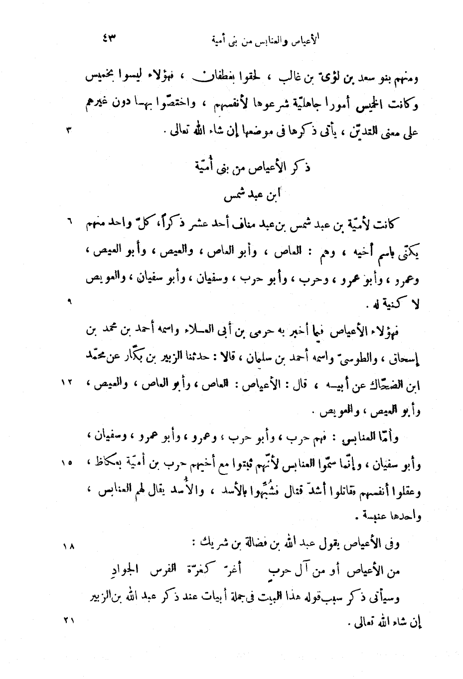 فهؤلاء الأعياص فيما أخبر به حرمى بن أبى العلاء واسمه أحمد بن محمد بن إسحاق، والطوسىّ واسمه أحمد بن سليمان، قالا: حدثنا الزبير بن بكّار عن محمّد ابن الضحّاك عن أبيه، قال: الأعياص: العاص، وأبو العاص، والعيص، وأبو العيص، والعويص.