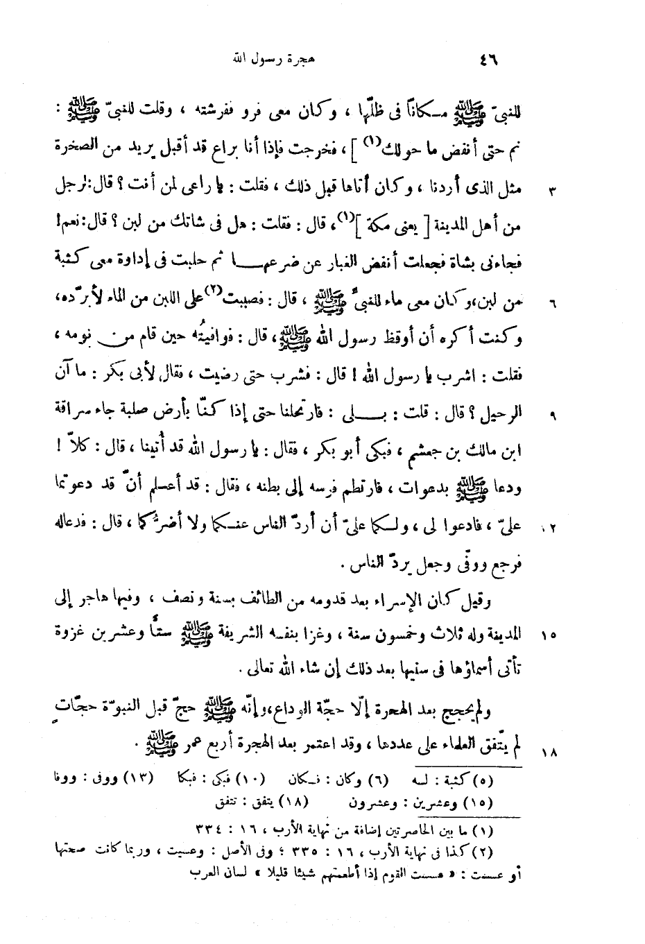 نم حتى أنفض ما حولك (1)]، فخرجت فإذا أنا براع قد أقبل يريد من الصخرة مثل الذى أردنا، وكان أتاها قبل ذلك، فقلت: يا راعى لمن أنت؟ قال: لرجل من أهل المدينة [يعنى مكة] (1)، قال: فقلت: هل فى شاتك من لبن؟ قال: نعم! فجاءنى بشاة فجعلت أنفض الغبار عن ضرعها ثم حلبت فى إداوة معى كثبة من لبن، وكان معى ماء للنبىّ صلّى الله عليه وسلم، قال: فصببت (2) على اللبن من الماء لأبرّده، وكنت أكره أن أوقظ رسول الله صلّى الله عليه وسلم، قال: فوافيته حين قام من نومه، فقلت: اشرب يا رسول الله! قال: فشرب حتى رضيت، فقال لأبى بكر: ما آن الرحيل؟ قال: قلت: بلى: فارتحلنا حتى إذا كنّا بأرض صلبة جاء سراقة ابن مالك بن جعشم، فبكى أبو بكر، فقال: يا رسول الله قد أتينا، قال: كلاّ! ودعا صلّى الله عليه وسلم بدعوات، فارتطم فرسه إلى بطنه، فقال: قد أعلم أنّ قد دعوتما علىّ، فادعوا لى، ولكما علىّ أن أردّ الناس عنكما ولا أضرّكما، قال: فدعا له فرجع ووفّى وجعل يردّ الناس.