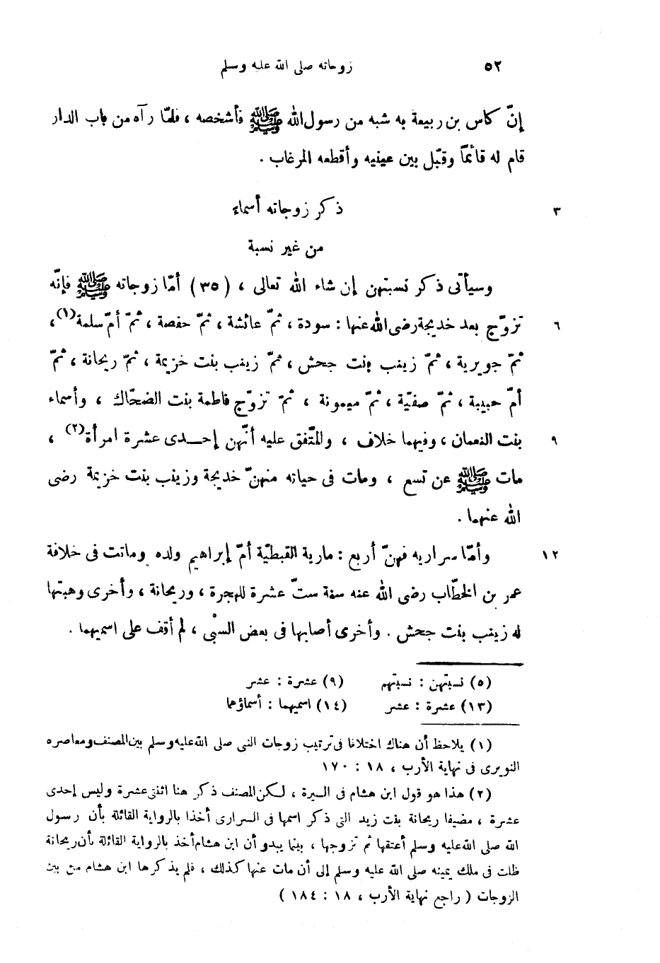 وسيأتى ذكر نسبتهن إن شاء الله تعالى، (35) أمّا زوجاته صلّى الله عليه وسلم فإنّه تزوّج بعد خديجة رضى الله عنها: سودة، ثمّ عائشة، ثمّ حفصة، ثمّ أمّ سلمة (1)، ثمّ جويرية، ثمّ زينب بنت جحش، ثمّ زينب بنت خزيمة، ثمّ ريحانة، ثمّ أمّ حبيبة، ثمّ صفيّة، ثمّ ميمونة، ثمّ تزوّج فاطمة بنت الضحّاك، وأسماء بنت النعمان، وفيهما خلاف، والمتّفق عليه أنّهن إحدى عشرة امرأة (2)، مات صلّى الله عليه وسلم عن تسع، ومات فى حياته منهنّ خديجة وزينب بنت خزيمة رضى الله عنهما.