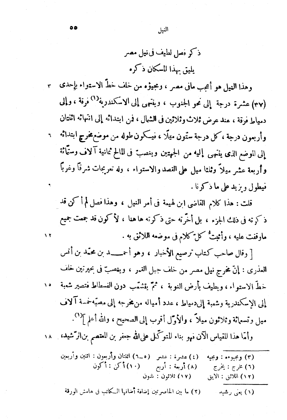 وهذا النيل هو أعجب ما فى مصر، ومجيؤه من خلف خطّ الاستواء بإحدى (37) عشرة درجة إلى نحو الجنوب، وينتهى إلى الاسكندرية (1) فرقة، وإلى دمياط فرقة، عند عرض ثلاث وثلاثين فى الشمال، فمن ابتدائه إلى انتهائه اثنتان وأربعون درجة، كل درجة ستّون ميلا، فيكون طوله من موضع مخرج ابتدائه إلى الموضع الذى ينتهى إليه من الجهتين وينصبّ فى المالح ثمانية آلاف وستّمائة وأربعة عشر ميلا وثلثا ميل على القصد والاستواء، وله تعريجات شرفا وغربا فيطول ويزيد على ما ذكرنا.