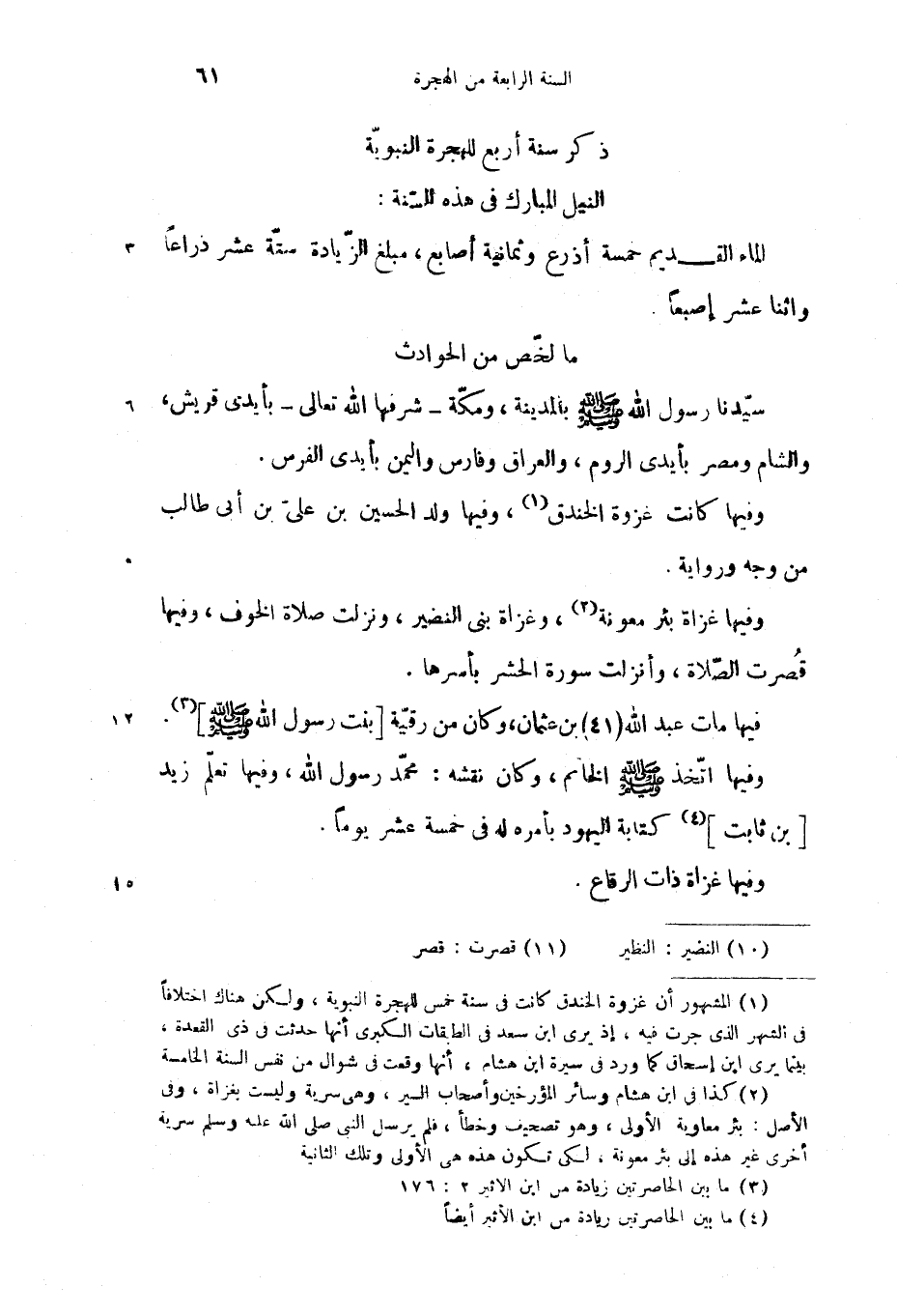 وفيها غزاة بئر معونة (2)، وغزاة بنى النضير، ونزلت صلاة الخوف، وفيها قصرت الصّلاة، وأنزلت سورة الحشر بأسرها.