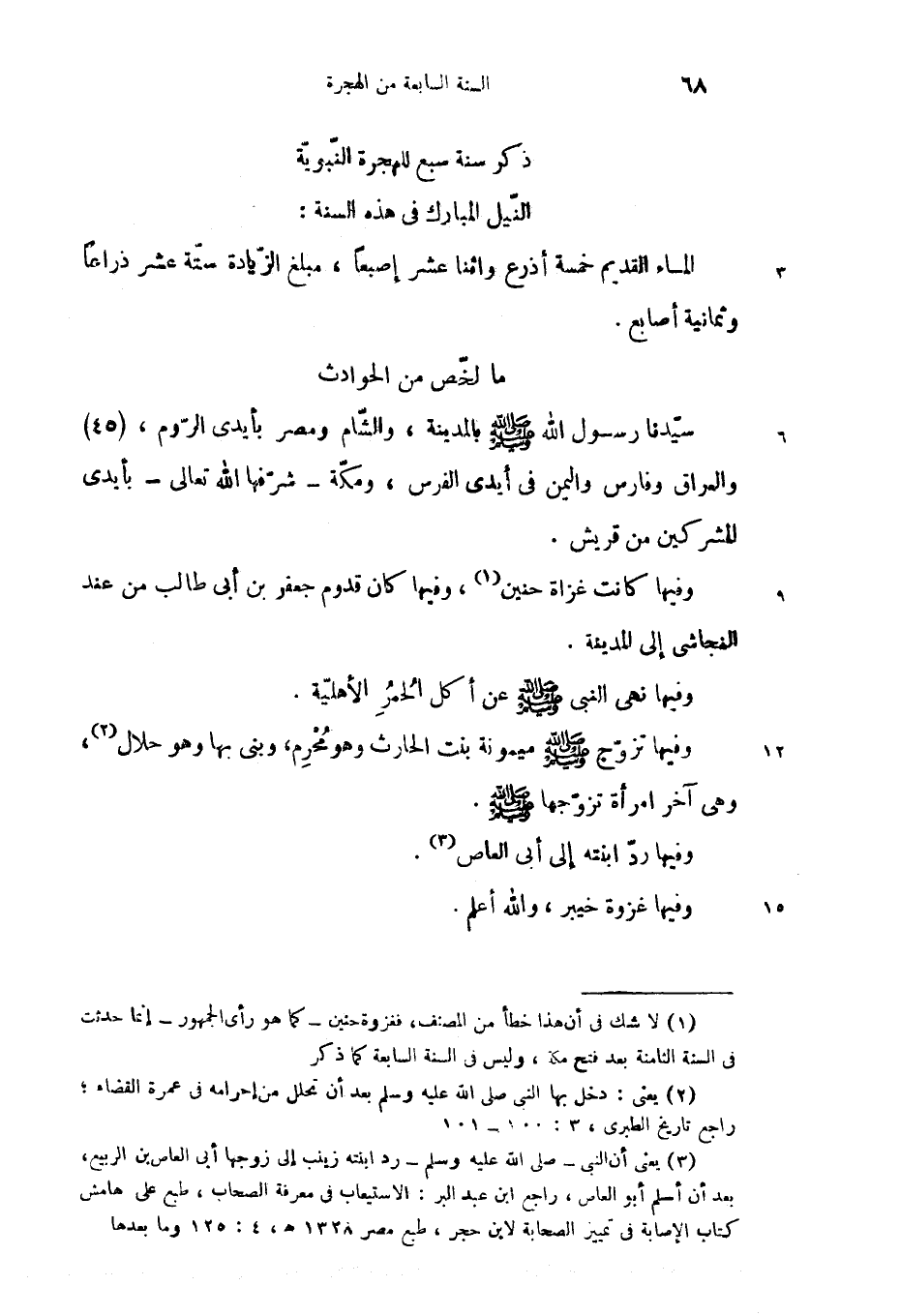 وفيها تزوّج صلّى الله عليه وسلم ميمونة بنت الحارث وهو محرم، وبنى بها وهو حلال (2)، وهى آخر امرأة تزوّجها صلّى الله عليه وسلم.