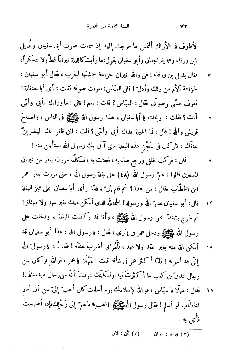 لأطوف فى الأراك ألتمس ما خرجت إليه إذ سمعت صوت أبى سفيان وبديل ابن ورقاء وهما يتراجعان وأبو سفيان يقول: ما رأيت كالليلة نيرانا قطّ ولا عسكرا، فقال بديل بن ورقاء: هى والله نيران خزاعة حمشتها الحرب، فقال أبو سفيان: خزاعة ألأم من ذلك وأذلّ! قال العبّاس: فعرفت صوته فقلت: أى أبا حنظلة! فعرف حسّى وصوتى فقال: العبّاس؟ قلت: نعم! قال: ما وراءك بأبى وأمّى أنت؟ فقلت: ويحك يا أبا سفيان، هذا رسول الله صلّى الله عليه وسلم فى الناس، واصباح قريش والله! قال: فما الحيلة فداك أبى وأمّى؟ قلت: لئن ظفر بك ليضربنّ عنقك، فاركب فى عجز هذه البغلة حتى آتى بك رسول الله تستأمن منه!