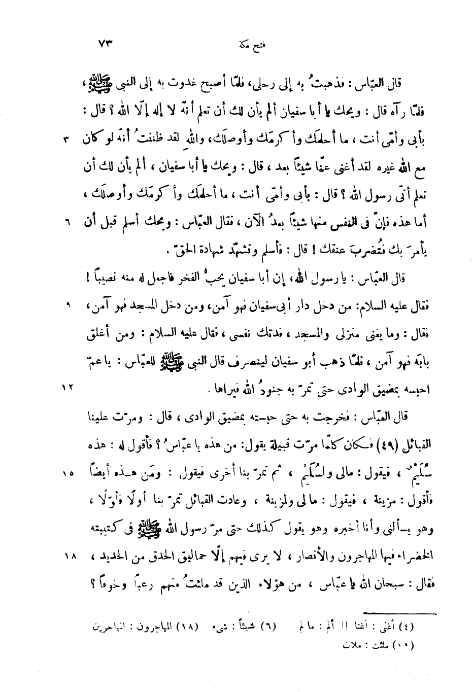 قال العبّاس: يا رسول الله، إن أبا سفيان يحبّ الفخر فاجعل له منه نصيبا! فقال عليه السلام: من دخل دار أبى سفيان فهو آمن، ومن دخل المسجد فهو آمن، فقال: وما يغنى منزلى والمسجد، فدتك نفسى، فقال عليه السلام: ومن أغلق بابه فهو آمن، فلمّا ذهب أبو سفيان لينصرف قال النبى صلّى الله عليه وسلم للعبّاس: يا عمّ احبسه بمضيق الوادى حتى تمرّ به جنود الله فيراها.