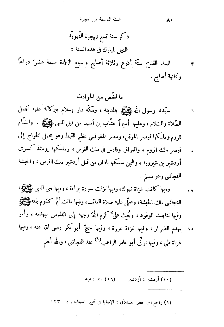 وفيها كانت غزاة تبوك، وفيها نزلت سورة براءة، وفيها نعى النبى صلّى الله عليه وسلم، النجاشى ملك الحبشة، وصلّى عليه صلاة الغائب، وفيها ماتت أمّ كلثوم بنته صلّى الله عليه وسلم وفيها تتابعت الوفود، وبعث علىّ كرم الله وجهه إلى القليص ليهدمه، وأمر بهدم الضرار، وفيها غزاة عروة، وفيها حجّ أبو بكر رضى الله عنه، وفيها غزاة طى، وفيها توفّى أبو عامر الراهب (1) عند النجاشى، والله أعلم.