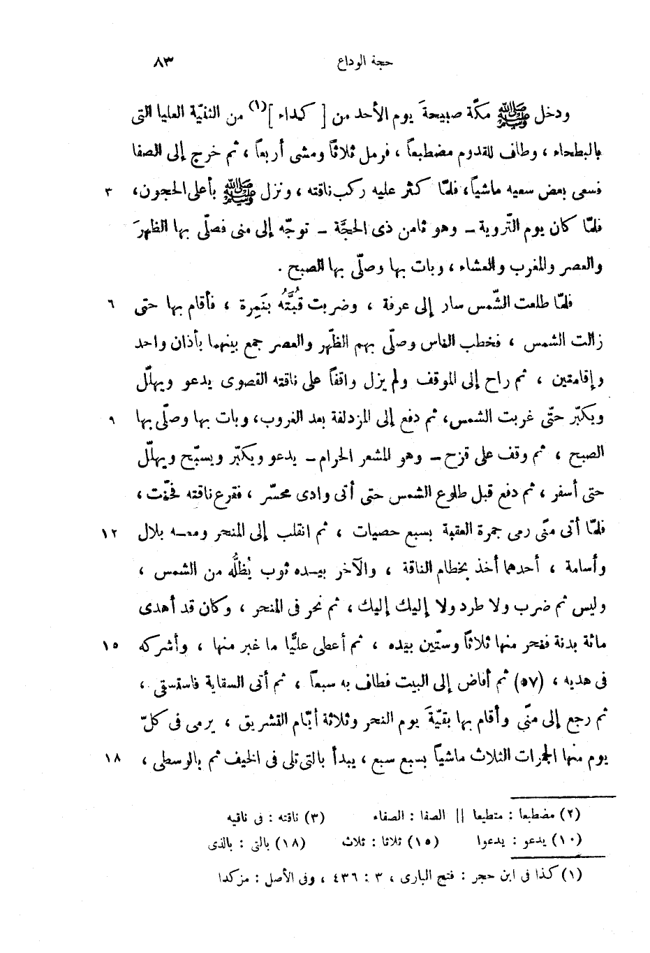 فلمّا طلعت الشّمس سار إلى عرفة، وضربت قبتّه بنمرة، فأقام بها حتى زالت الشمس، فخطب الناس وصلّى بهم الظّهر والعصر جمع بينهما بأذان واحد وإقامتين، ثم راح إلى الموقف ولم يزل واقفا على ناقته القصوى يدعو ويهلّل ويكبّر حتّى غربت الشمس، ثم دفع إلى المزدلفة بعد الغروب، وبات بها وصلّى بها الصبح، ثم وقف على قزح-وهو المشعر الحرام-يدعو ويكبّر ويسبّح ويهلّل حتى أسفر، ثم دفع قبل طلوع الشمس حتى أتى وادى محسّر، فقرع ناقته فحنّت، فلمّا أتى منى رمى جمرة العقبة بسبع حصيات، ثم انقلب إلى المنحر ومعه بلال وأسامة، أحدهما أخذ بخطام الناقة، والآخر بيده ثوب يظلّه من الشمس، وليس ثم ضرب ولا طرد ولا إليك إليك، ثم نحر فى المنحر، وكان قد أهدى مائة بدنة فنحر منها ثلاثا وستّين بيده، ثم أعطى عليّا ما غبر منها، وأشركه فى هديه، (57) ثم أفاض إلى البيت فطاف به سبعا، ثم أتى السقاية فاستسقى، ثم رجع إلى منّى وأقام بها بقيّة يوم النحر وثلاثة أيّام التشريق، يرمى فى كلّ يوم منها الجمرات الثلاث ماشيا بسبع سبع، يبدأ بالتى تلى فى الخيف ثم بالوسطى،