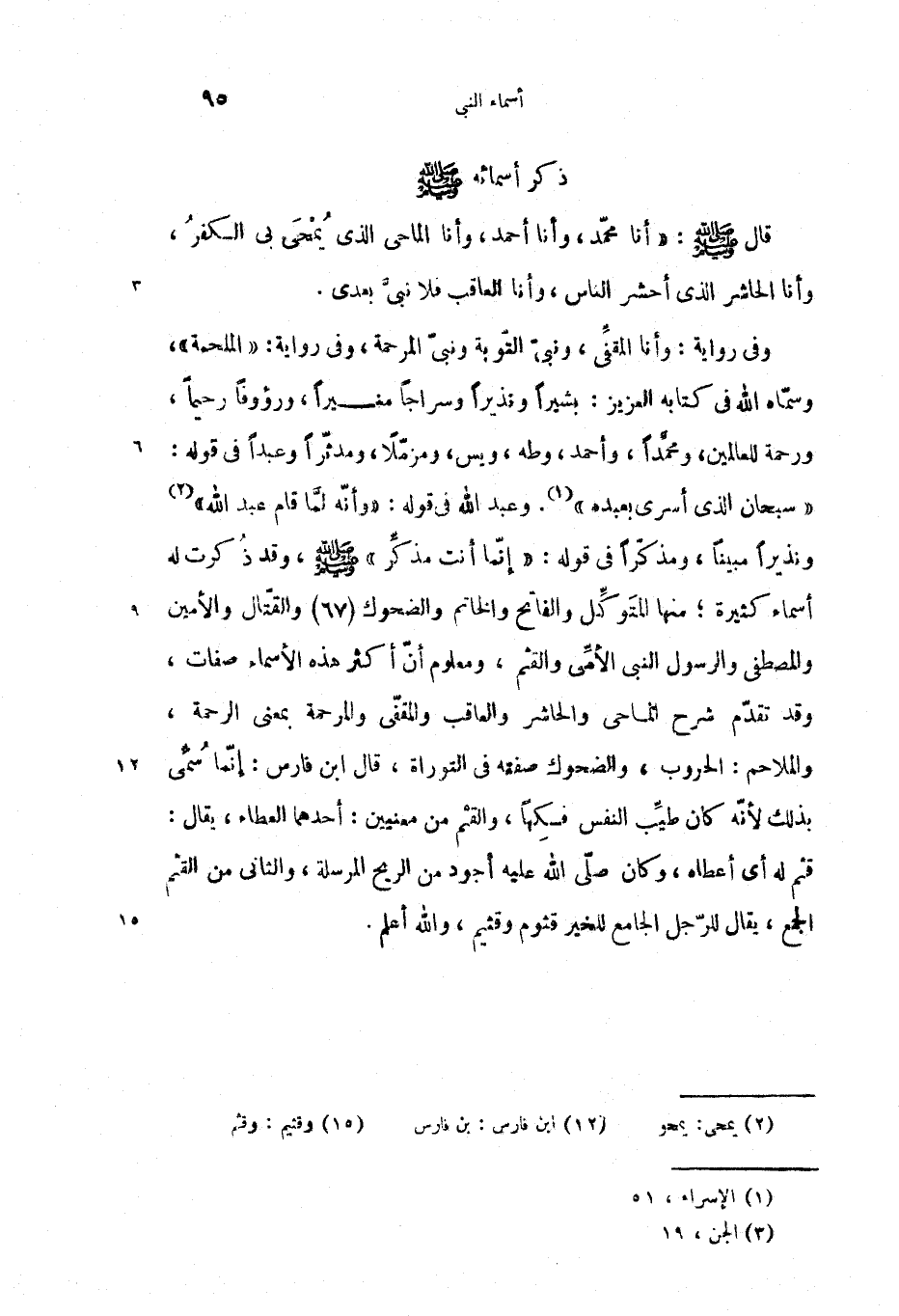 {سُبْحانَ الَّذِي أَسْرى بِعَبْدِهِ»} (1). وعبد الله فى قوله: {وَأَنَّهُ لَمّا قامَ عَبْدُ اللهِ»} (2) ونذيرا مبينا، ومذكّرا فى قوله: {إِنَّما أَنْتَ مُذَكِّرٌ»} صلّى الله عليه وسلم، وقد ذكرت له أسماء كثيرة؛ منها المتوكّل والفاتح والخاتم والضحوك (67) والقتّال والأمين والمصطفى والرسول النبى الأمّى والقثم، ومعلوم أنّ أكثر هذه الأسماء صفات، وقد تقدّم شرح الماحى والحاشر والعاقب والمقفّى والمرحمة بمعنى الرحمة، والملاحم: الحروب، والضحوك صفته فى التوراة، قال ابن فارس: إنّما سمّى بذلك لأنّه كان طيّب النفس فكها، والقثم من معنيين: أحدهما العطاء، يقال: