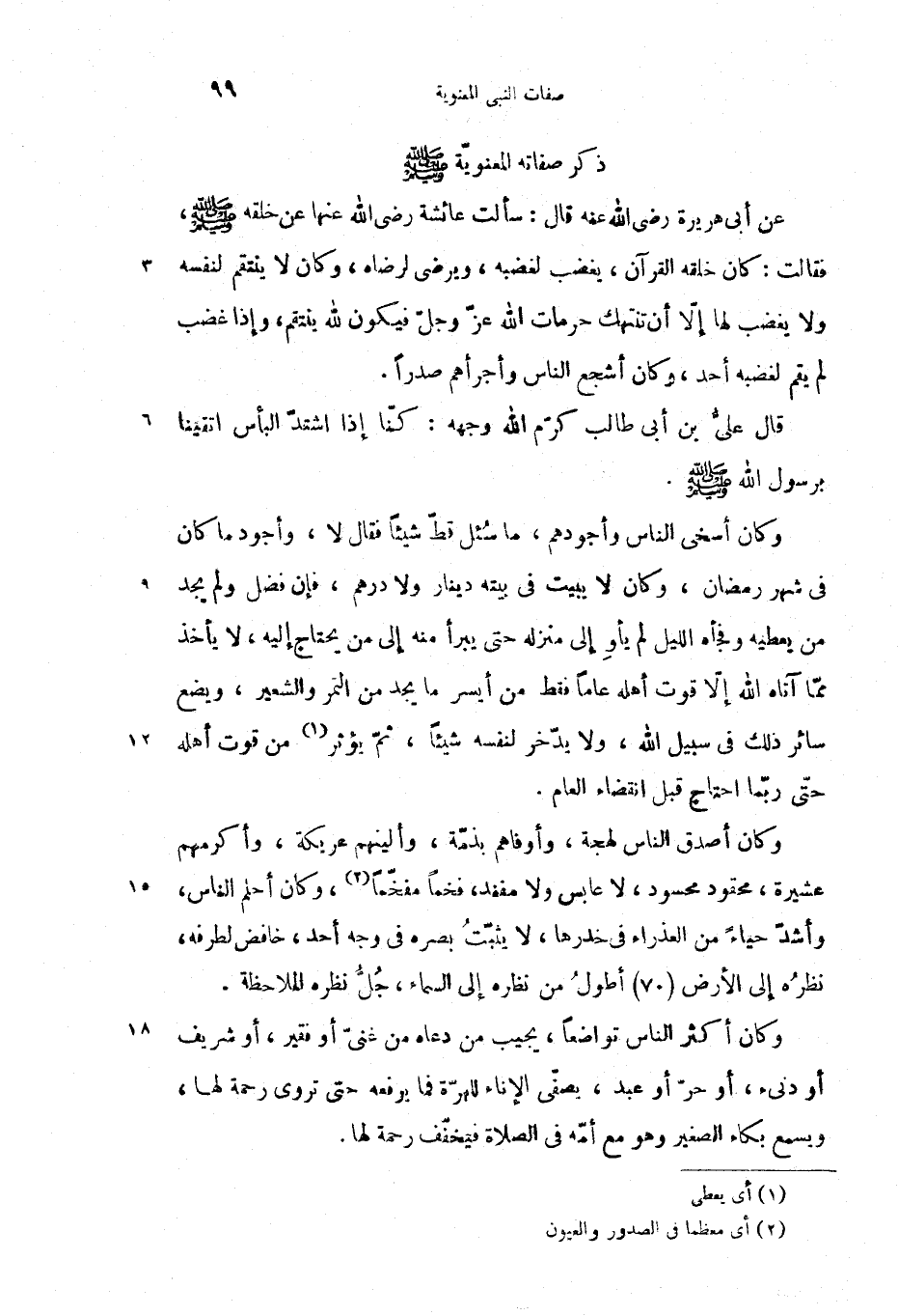 وكان أصدق الناس لهجة، وأوفاهم بذمّة، وألينهم عريكة، وأكرمهم عشيرة، محقود محسود، لا عابس ولا مفند، فخما مفخّما (2)، وكان أحلم الناس، وأشدّ حياء من العذراء فى خدرها، لا يثبّت بصره فى وجه أحد، خافض لطرفه، نظره إلى الأرض (70) أطول من نظره إلى السماء، جلّ نظره الملاحظة.