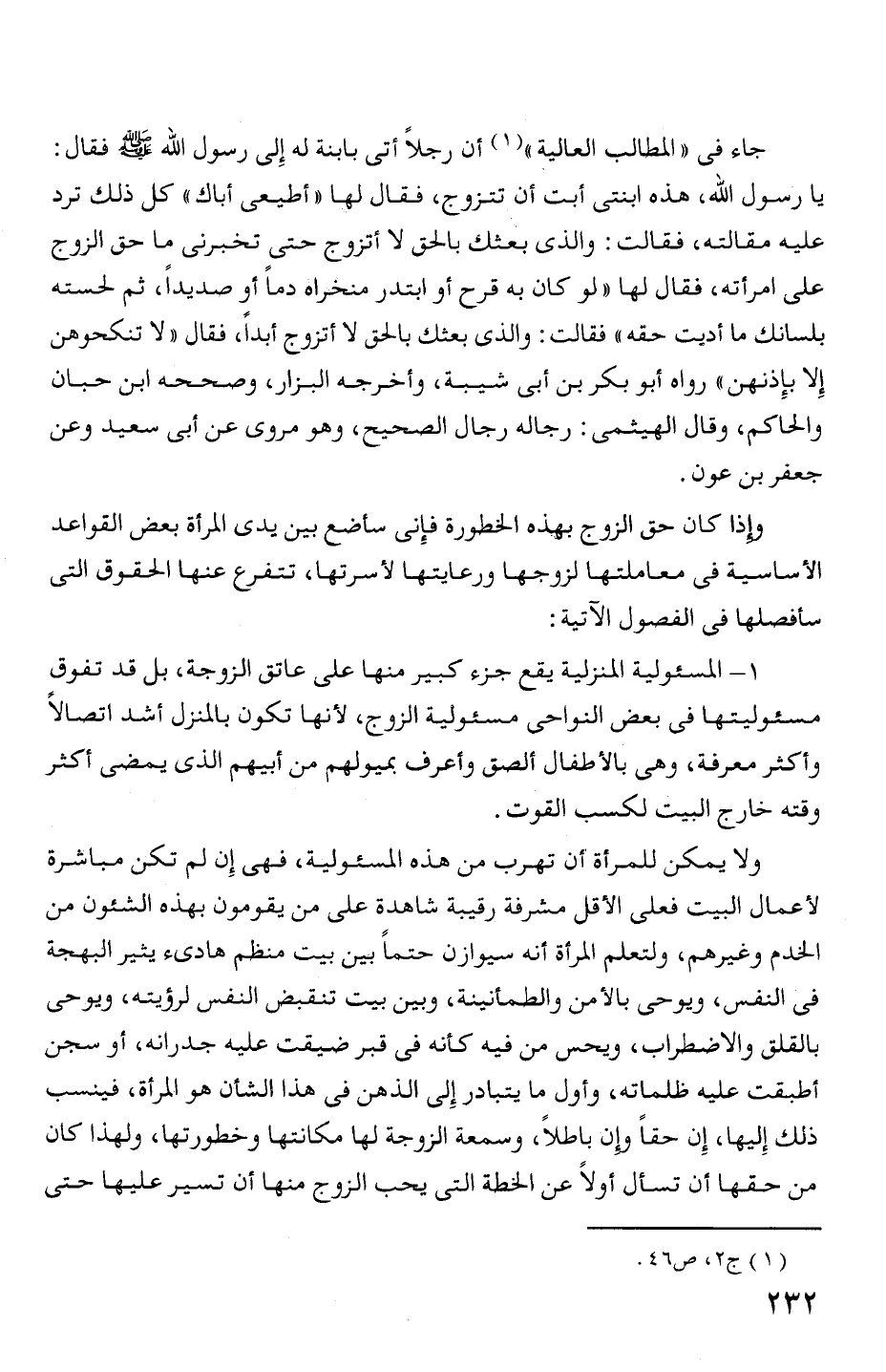 مسئوليتها فى بعض النواحى مسئولية الزوج، لأنها تكون بالمنزل أشد اتصالا