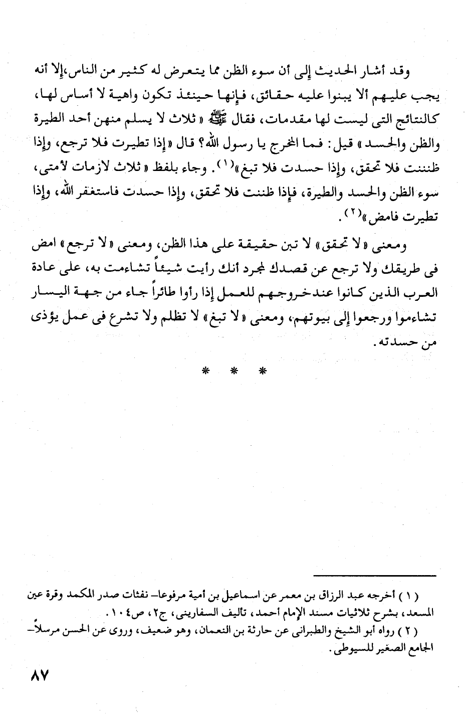 والظن والحسد " قيل: فما الخرج يا رسول الله؟ قال " إذا تطيرت فلا ترجع، وإذا