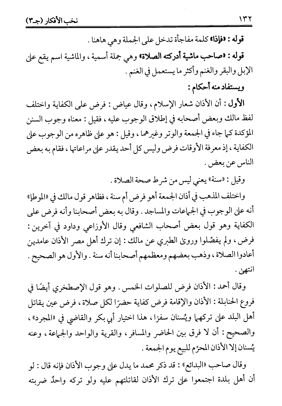 وقال أحمد: الأذان فرض للصلوات الخمس. وهو قول الإصطخري أيضًا في فروع الحنابلة: الأذان والإقامة فرض كفاية حضرًا لكل صلاة، فرض عين يقاتل أهل البلد على تركهما ويُسنان سفرًا، هذا اختيار أبي بكر والقاضي في "المجرد"، والصحيح: أن لا فرق بين الحاضر والمسافر، والقرية والواحد والجماعة، وعنه يُسنان إلا الأذان المحرِّم للبيع يوم الجمعة.