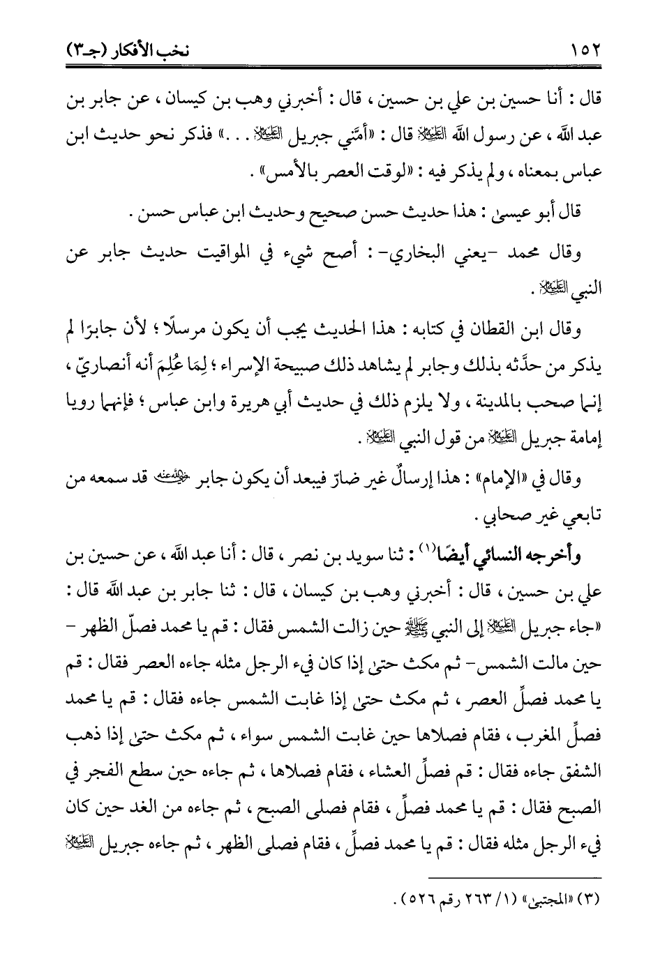 وقال ابن القطان في كتابه: هذا الحديث يجب أن يكون مرسلًا؛ لأن جابرًا لم يذكر من حدَّثه بذلك وجابر لم يشاهد ذلك صبيحة الإسراء؛ لِمَا عُلِمَ أنه أنصاريّ، إنما صحب بالمدينة، ولا يلزم ذلك في حديث أبي هريرة وابن عباس؛ فإنهما رويا إمامة جبريل - عليه السلام - من قول النبي - عليه السلام -.