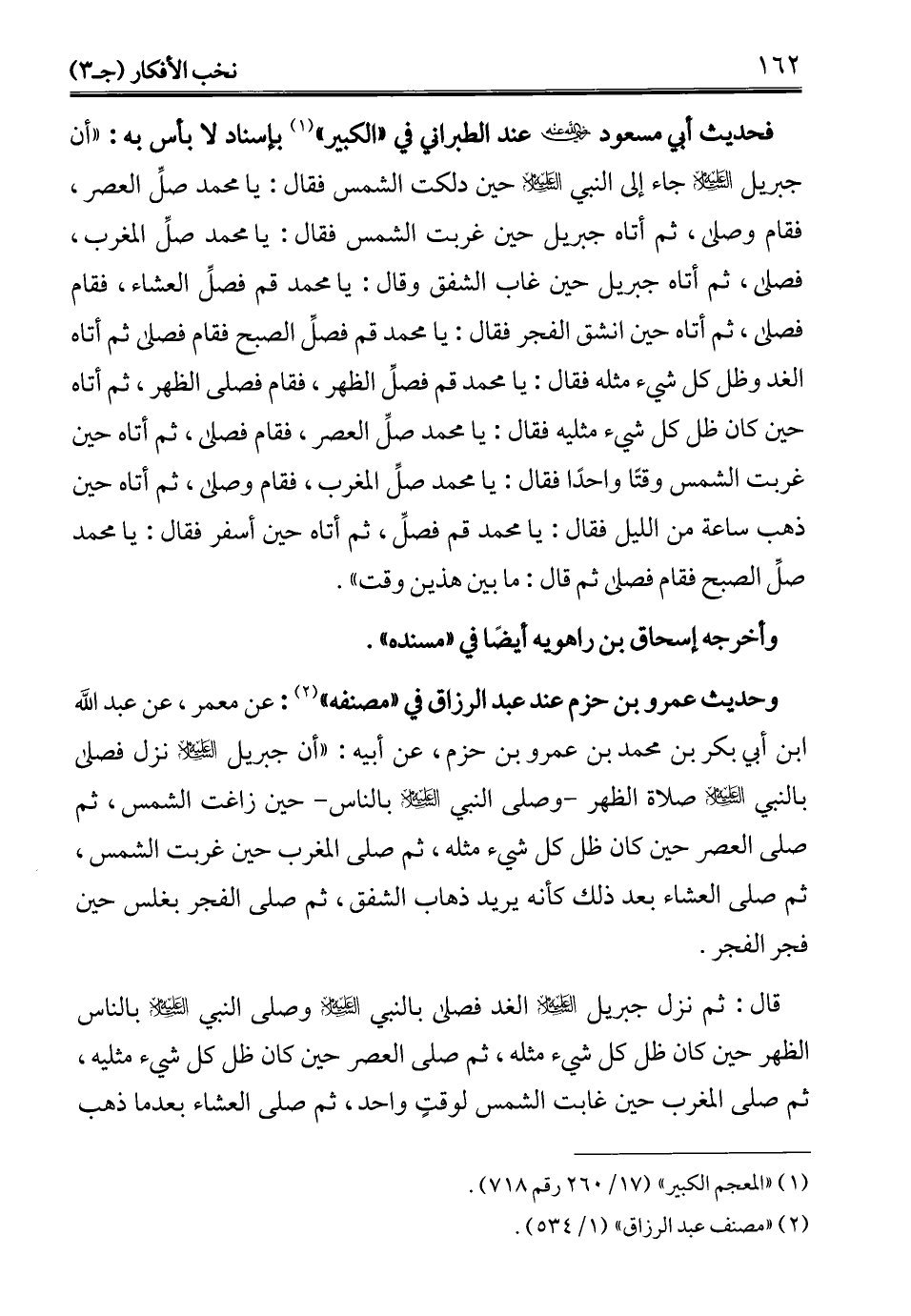 وحديث عمرو بن حزم عند عبد الرزاق في "مصنفه" (¬2): عن معمر، عن عبد الله ابن أبي بكر بن محمد بن عمرو بن حزم، عن أبيه: "أن جبريل - عليه السلام - نزل فصلى بالنبي - عليه السلام - صلاة الظهر- وصلى النبي - عليه السلام - بالناس -حين زاغت الشمس، ثم صلى العصر حين كان ظل كل شيء مثله، ثم صلى المغرب حين غربت الشمس، ثم صلى العشاء بعد ذلك كأنه يريد ذهاب الشفق، ثم صلى الفجر بغلس حين فجر الفجر.