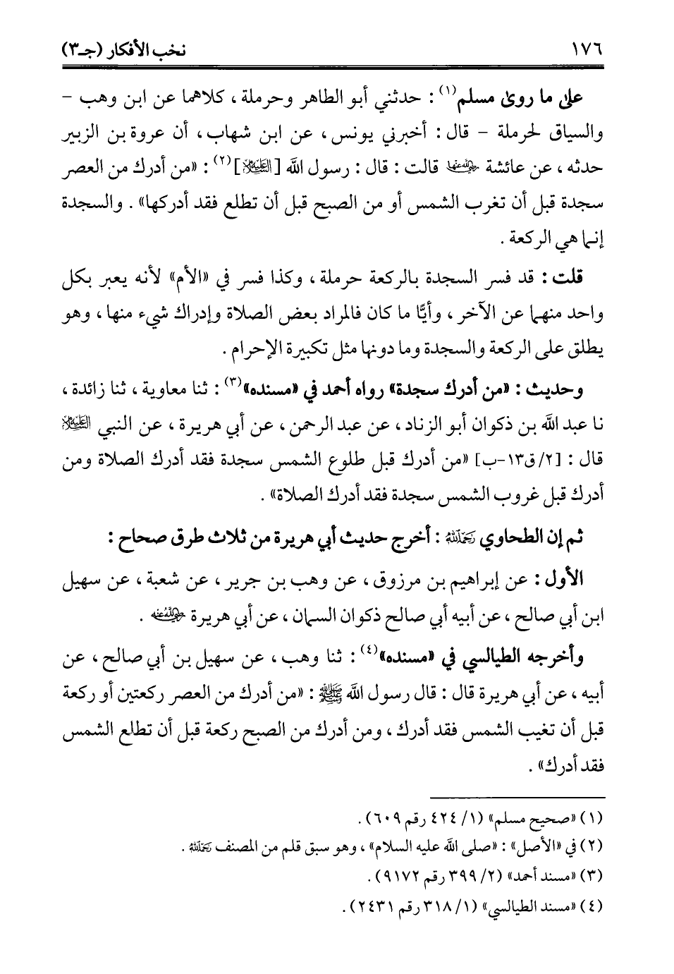 وحديث: "من أدرك سجدة" رواه أحمد في "مسنده" (¬3): ثنا معاوية، ثنا زائدة، نا عبد الله بن ذكوان أبو الزناد، عن عبد الرحمن، عن أبي هريرة، عن النبي - عليه السلام - قال: "من أدرك قبل طلوع الشمس سجدة فقد أدرك الصلاة ومن أدرك قبل غروب الشمس سجدة فقد أدرك الصلاة".