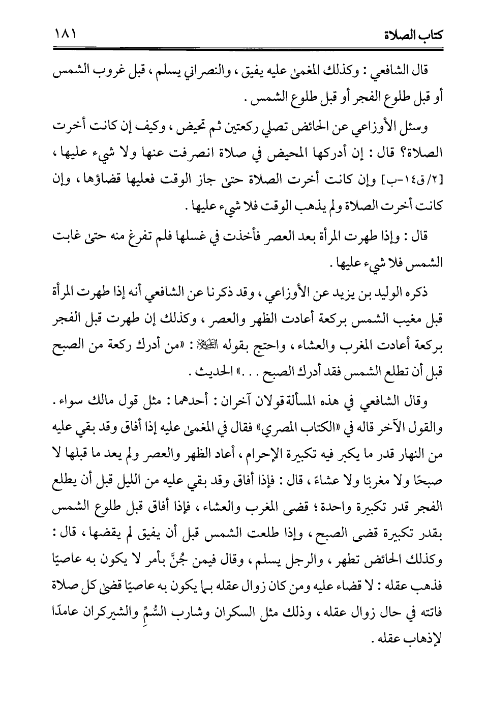 قال الشافعي: وكذلك المغمى عليه يفيق، والنصراني يسلم، قبل غروب الشمس أو قبل طلوع الفجر أو قبل طلوع الشمس.