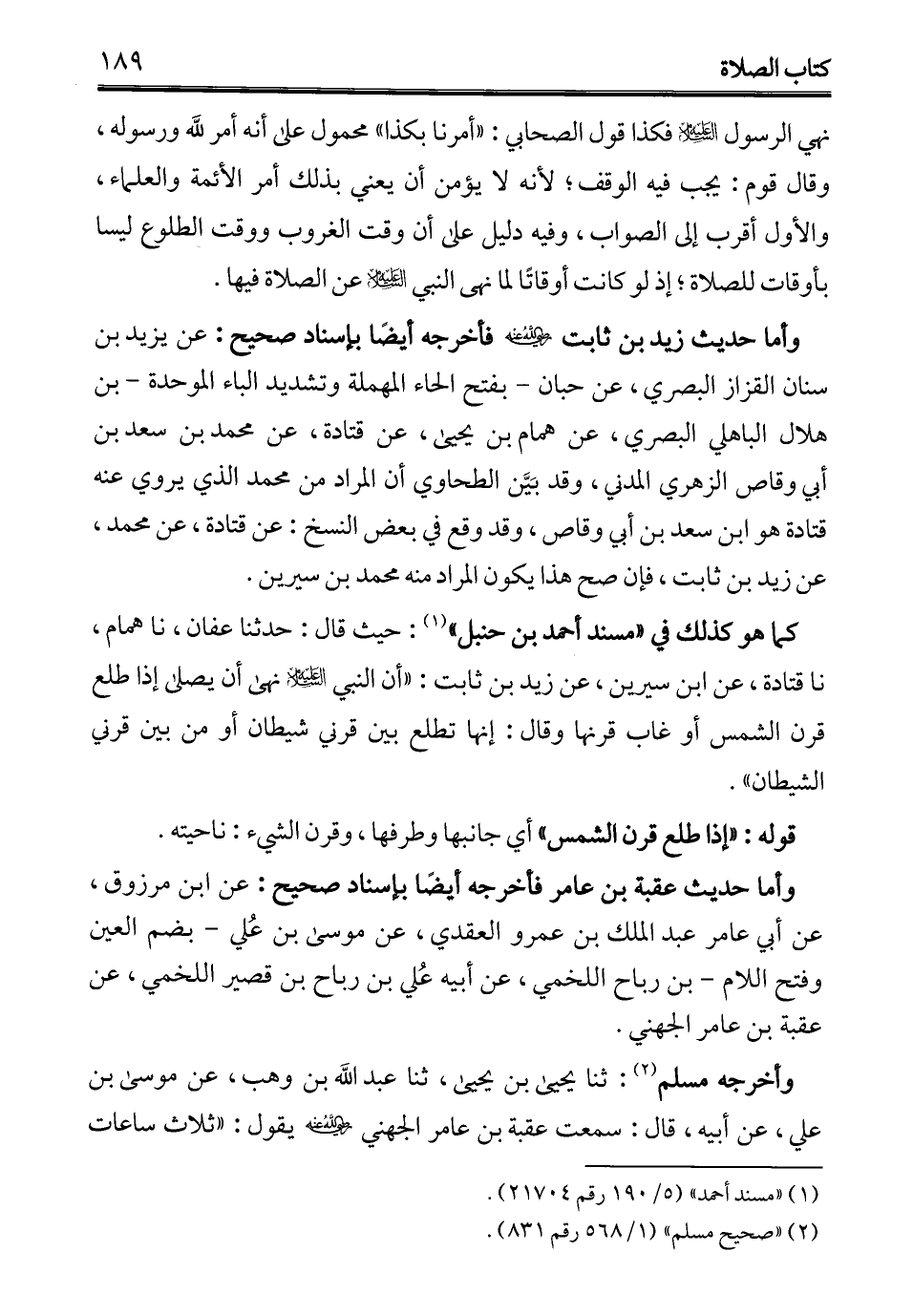 كما هو كذلك في "مسند أحمد بن حنبل" (¬1): حيث قال: حدثنا عفان، نا همام، نا قتادة، عن ابن سيرين، عن زيد بن ثابت: "أن النبي - عليه السلام - نهى أن يصل إذا طلع قرن الشمس أو غاب قرنها وقال: إنها تطلع بين قرني شيطان أو من بين قرني الشيطان".
