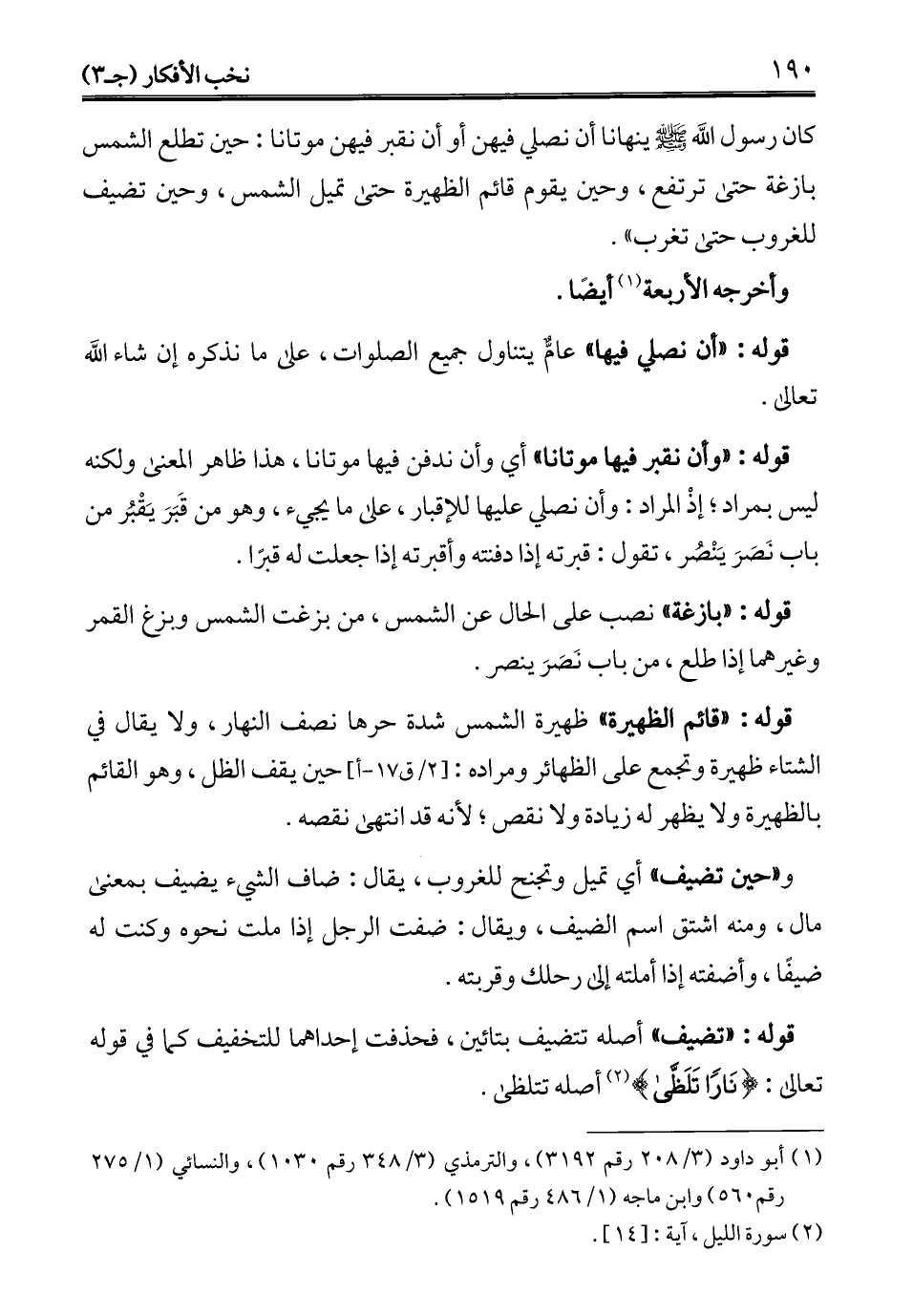 كان رسول الله - صلى الله عليه وسلم - ينهانا أن نصلي فيهن أو أن تقبر فيهن موتانا: حين تطلع الشمس بازغة حتى ترتفع، وحن يقوم قائم الظهيرة حتى تميل الشمس، وحين تضيف للغروب حتى تغرب".