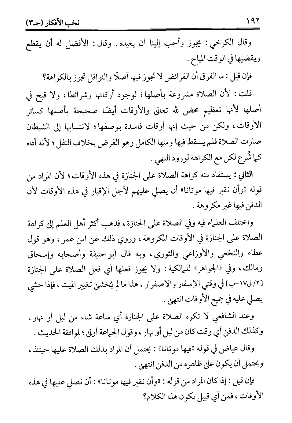 فإن قيل: إذا كان المراد من قوله: "وأن نقبر فيها موتانا": أن نصلي عليها في هذه الأوقات، فمن أي قبيل يكون هذا الكلام؟