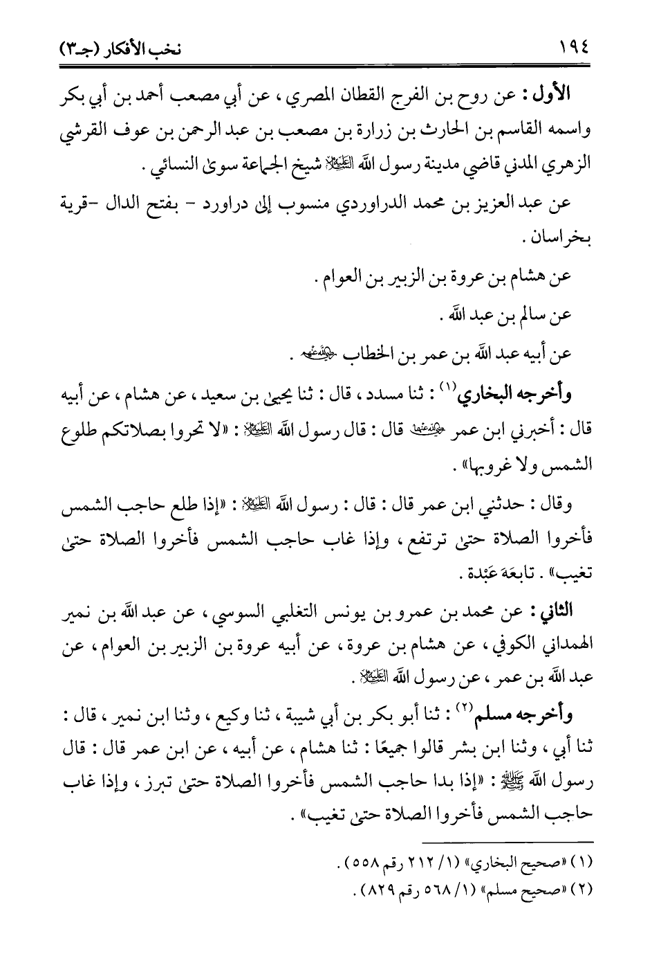 وأخرجه مسلم (¬2): ثنا أبو بكر بن أبي شيبة، ثنا وكيع، وثنا ابن نمير، قال: ثنا أبي، وثنا ابن بشر قالوا جميعًا: ثنا هشام، عن أبيه، عن ابن عمر قال: قال رسول الله - صلى الله عليه وسلم -: "إذا بدا حاجب الشمس فأخروا الصلاة حتى تبرز، وإذا غاب حاجب الشمس فأخروا الصلاة حتى تغيب".