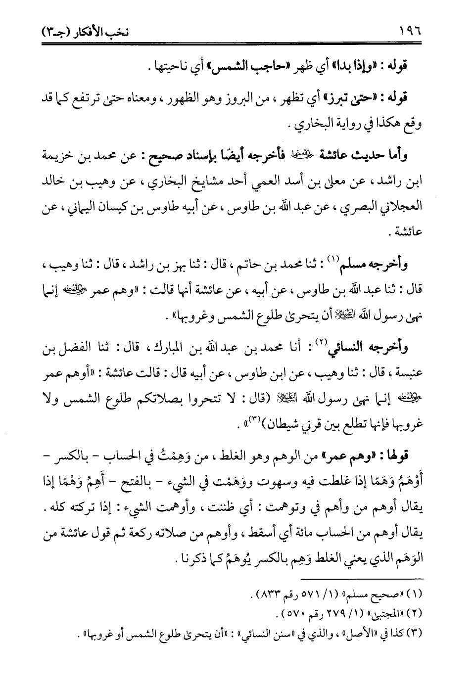وأخرجه مسلم (¬1): ثنا محمد بن حاتم، قال: ثنا بهز بن راشد، قال: ثنا وهيب، قال: ثنا عبد الله بن طاوس، عن أبيه، عن عائشة أنها قالت: "وهم عمر - رضي الله عنه - إنما نهى رسول الله - عليه السلام - أن يتحرى طلوع الشمس وغروبها".