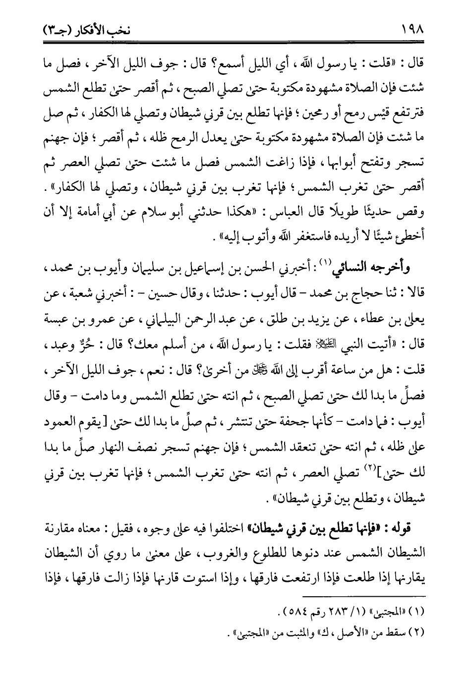 وأخرجه النسائي (¬1): أخبرني الحسن بن إسماعيل بن سليمان وأيوب بن محمد، قالا: ثنا حجاج بن محمد -قال أيوب: حدثنا، وقال حسين-: أخبرني شعبة، عن يعلى بن عطاء، عن يزيد بن طلق، عن عبد الرحمن البيلماني، عن عمرو بن عبسة قال: "أتيت النبي - عليه السلام - فقلت: يا رسول الله، من أسلم معك؟ قال: حُرٌّ وعبد، قلت: هل من ساعة أقرب إلى الله -عز وجل - من أخرى؟ قال: نعم، جوف الليل الآخر، فصلِّ ما بدا لك حتى تصلي الصبح، ثم انته حتى تطلع الشمس وما دامت -وقال أيوب: فما دامت- كأنها جحفة حتى تنتشر، ثم صلِّ ما بدا لك حتى [يقوم العمود على ظله، ثم انته حتى تنعقد الشمس؛ فإن جهنم تسجر نصف النهار صلِّ ما بدا لك حتى] (¬2) تصلي العصر، ثم انته حتى تغرب الشمس؛ فإنها تغرب بين قرني شيطان، وتطلع بين قرني شيطان".