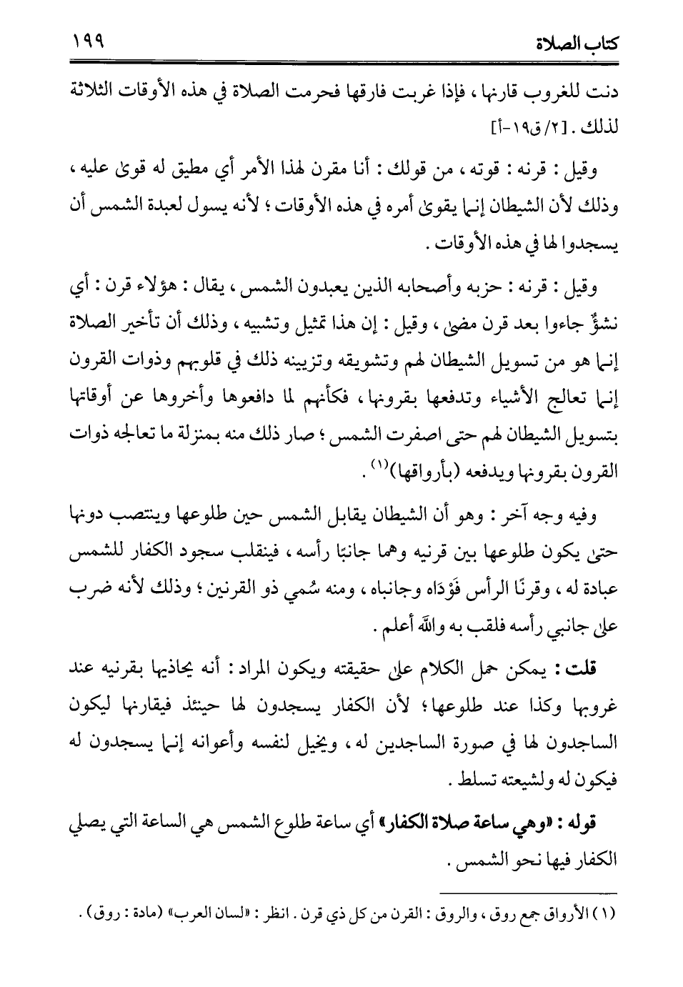 وقيل: قرنه: حزبه وأصحابه الذين يعبدون الشمس، يقال: هؤلاء قرن: أي نشؤٌ جاءوا بعد قرن مضى، وقيل: إن هذا تمثيل وتشبيه، وذلك أن تأخير الصلاة إنما هو من تسويل الشيطان لهم وتشويقه وتزيينه ذلك في قلوبهم وذوات القرون إنما تعالج الأشياء وتدفعها بقرونها، فكأنهم لما دافعوها وأخروها عن أوقاتها بتسويل الشيطان لهم حتى اصفرت الشمس؛ صار ذلك منه بمنزلة ما تعالجه ذوات القرون بقرونها ويدفعه (بأرواقها) (¬1).