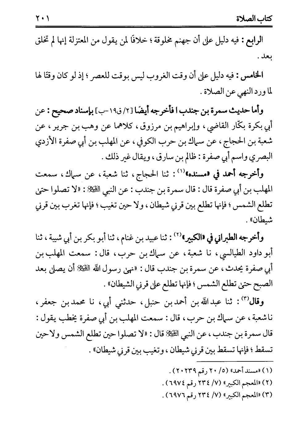 وقال (¬3): ثنا عبد الله بن أحمد بن حنبل، حدثني أبي، نا محمد بن جعفر، نا شعبة، عن سماك بن حرب، قال: سمعت المهلب بن أبي صفرة يخطب يقول: قال سمرة بن جندب، عن النبي - عليه السلام - قال: "لا تصلوا حين تطلع الشمس ولا حين تسقط؛ فإنها تسقط بين قرني شيطان، وتغيب بين قرني شيطان".