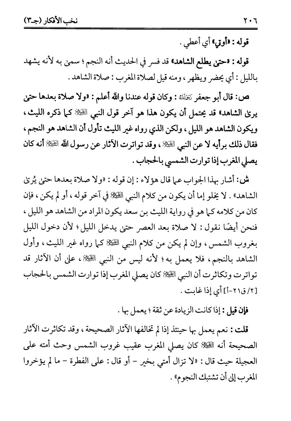 ص: قال أبو جعفر -رحمه الله -: وكان قوله عندنا والله أعلم: "ولا صلاة بعدها حتى يرى الشاهد" قد يحتمل أن يكون هذا هو آخر قول النبي - عليه السلام - كما ذكره الليث، ويكون الشاهد هو الليل، ولكن الذي رواه غير الليث تأول أن الشاهد هو النجم، فقال ذلك برأيه لا عن النبي - عليه السلام -، وقد تواترت الآثار عن رسول الله - عليه السلام - أنه كان يصلي المغرب إذا توارت الشمسي بالحجاب.