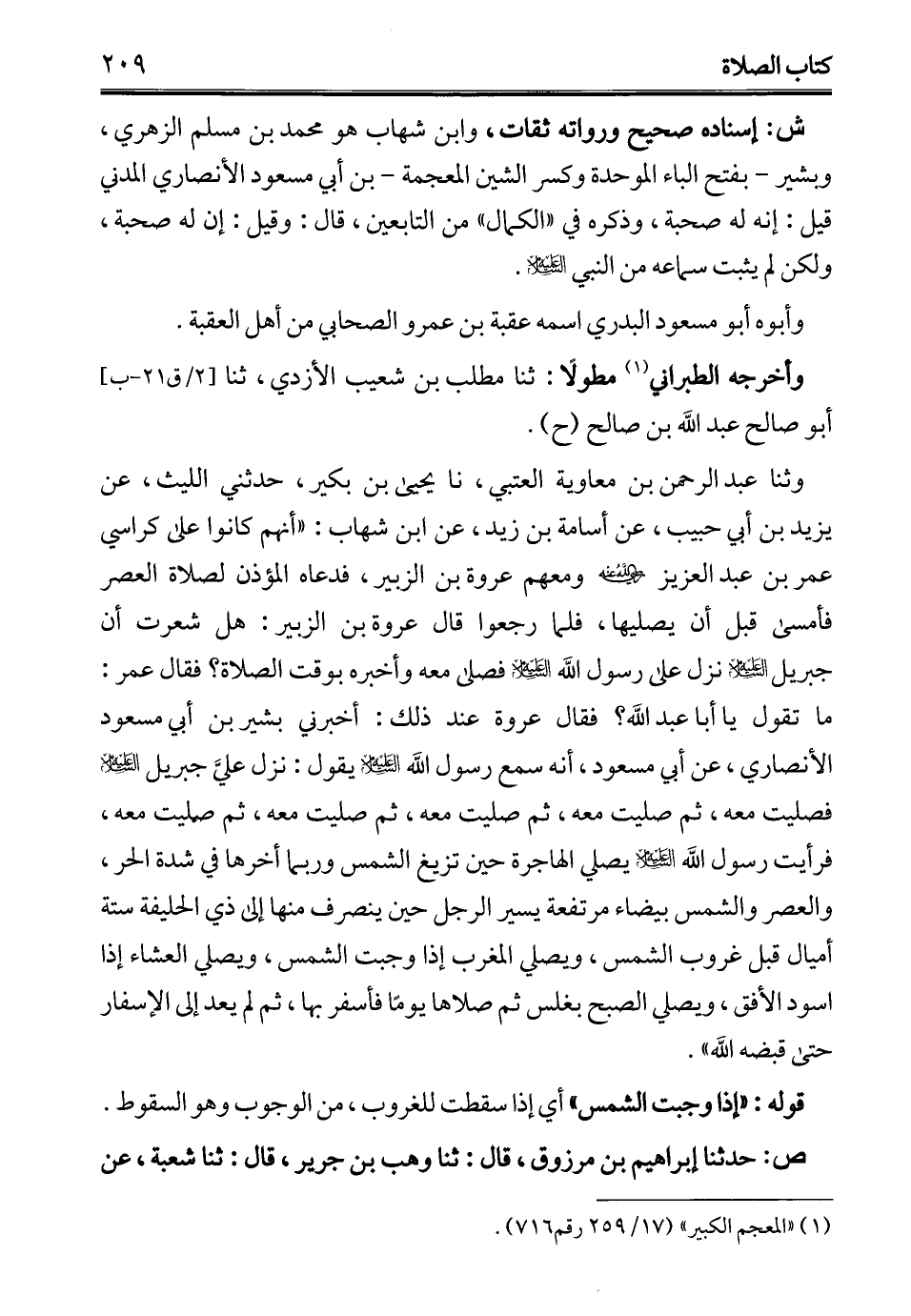 وثنا عبد الرحمن بن معاوية العتبي، نا يحيى بن بكير، حدثني الليث، عن يزيد بن أبي حبيب، عن أسامة بن زيد، عن ابن شهاب: "أنهم كانوا على كراسي عمر بن عبد العزيز - رضي الله عنه - ومعهم عروة بن الزبير، فدعاه المؤذن لصلاة العصر فأمسى قبل أن يصليها، فلما رجعوا قال عروة بن الزبير: هل شعرت أن جبريل - عليه السلام - نزل على رسول الله - عليه السلام - فصلى معه وأخبره بوقت الصلاة؟ فقال عمر: ما تقول يا أبا عبد الله؟ فقال عروة عند ذلك: أخبرني بشر بن أبي مسعود الأنصاري، عن أبي مسعود، أنه سمع رسول الله - عليه السلام - يقول: نزل عليَّ جبريل - عليه السلام - فصليت معه، ثم صليت معه، ثم صليت معه، ثم صليت معه، ثم صليت معه، فرأيت رسول الله - عليه السلام - يصلي الهاجرة حين تزيغ الشمس وربما أخرها في شدة الحر، والعصر والشمس بيضاء مرتفعة يسير الرجل حين ينصرف منها إلى ذي الحليفة ستة أميال قبل غروب الشمس، ويصلي المغرب إذا وجبت الشمس، ويصلي العشاء إذا اسود الأفق، ويصلي الصبح بغلس ثم صلاها يومًا فأسفر بها، ثم لم يعد إلى الإسفار حتى قبضه الله".