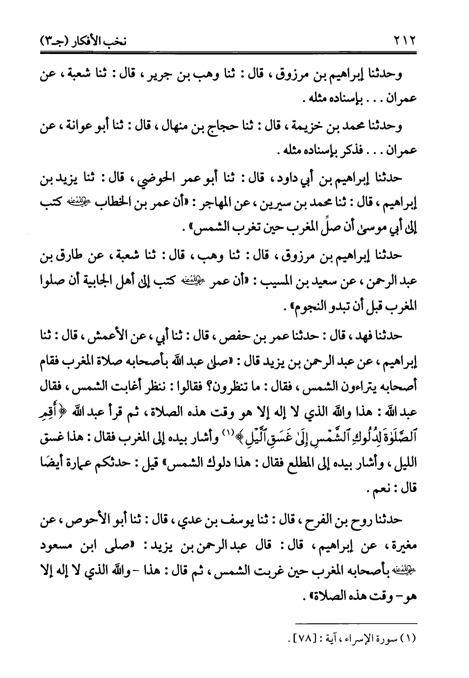 حدثنا فهد، قال: حدثنا عمر بن حفص، قال: ثنا أبي، عن الأعمش، قال: ثنا إبراهيم، عن عبد الرحمن بن يزيد قال: "صلى عبد الله بأصحابه صلاة المغرب فقام أصحابه يتراءون الشمس، فقال: ما تنظرون؟ فقالوا: ننظر أغابت الشمس، فقال عبد الله: هذا والله الذي لا إله إلا هو وقت هذه الصلاة، ثم قرأ عبد الله {أَقِمِ الصَّلَاةَ لِدُلُوكِ الشَّمْسِ إِلَى غَسَقِ اللَّيْلِ} (¬1) وأشار بيده إلى المغرب فقال: هذا غسق الليل، وأشار بيده إلى المطلع فقال: هذا دلوك الشمس" قيل: حدثكم عمارة أيضًا قال: نعم.