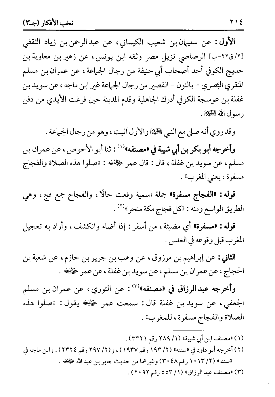 وأخرجه عبد الرزاق في "مصنفه" (¬3): عن الثوري، عن عمران بن مسلم الجعفي، عن سويد بن غفلة قال: سمعت عمر - رضي الله عنه - يقول: "صلوا هذه الصلاة والفجاج مسفرة، للمغرب".