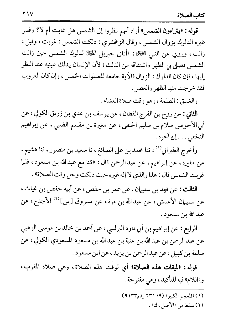 وأخرج الطبراني (¬1): ثنا محمد بن علي الصائغ، نا سعيد بن منصور، ثنا هشيم، عن مغيرة، عن إبراهيم، عن عبد الرحمن قال: "كنا مع عبد الله بن مسعود، فلما غربت الشمس قال: هذا والذي لا إله غيره حيث دلكت وحل وقت الصلاة".