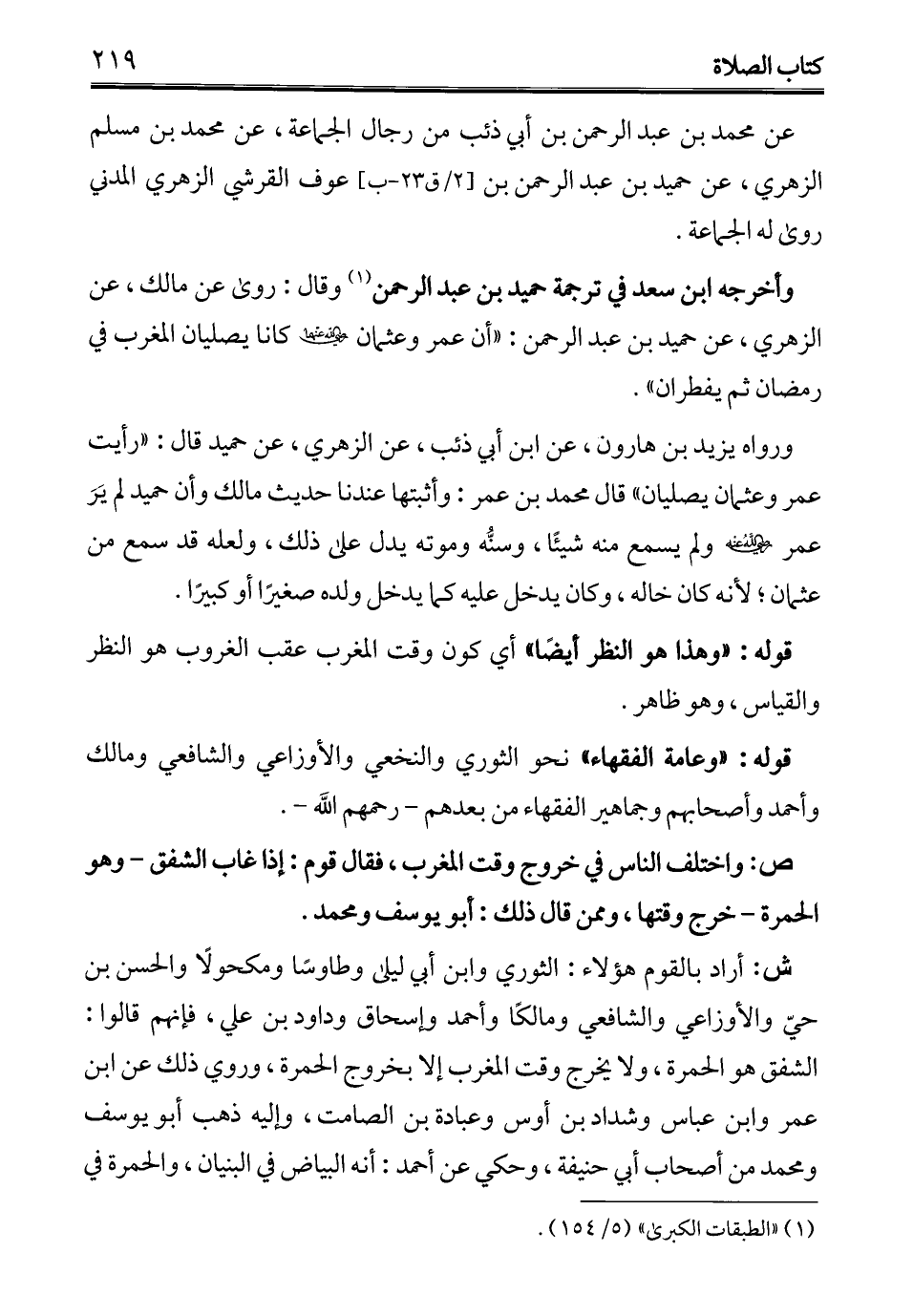 وأخرجه ابن سعد في ترجمة حميد بن عبد الرحمن (¬1) وقال: روى عن مالك، عن الزهري، عن حميد بن عبد الرحمن: "أن عمر وعثمان - رضي الله عنهما - كانا يصليان المغرب في رمضان ثم يفطران".