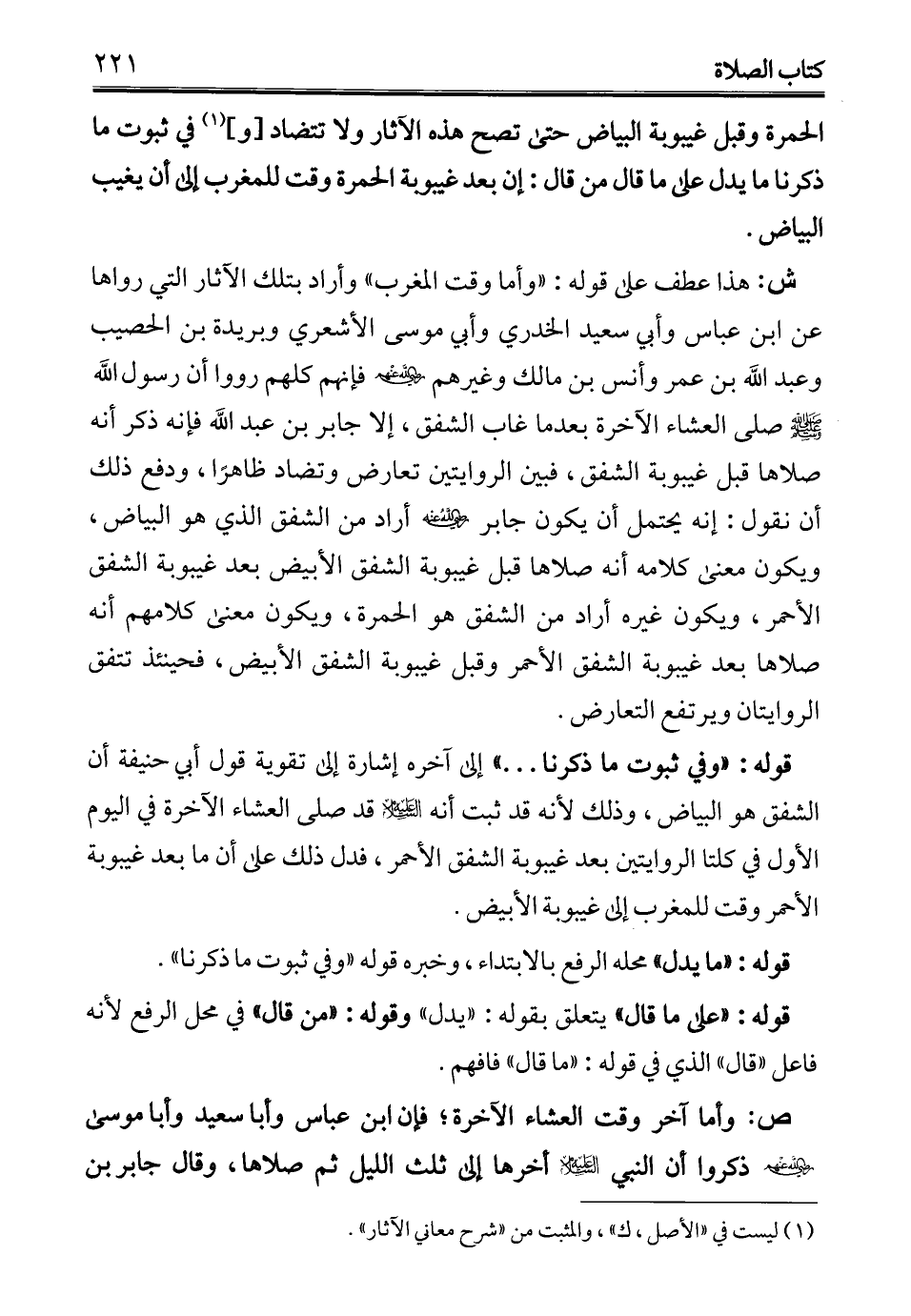 ش: هذا عطف على قوله: "وأما وقت المغرب" وأراد بتلك الآثار التي رواها عن ابن عباس وأبي سعيد الخدري وأبي موسى الأشعري وبريدة بن الحصيب وعبد الله بن عمر وأنس بن مالك وغيرهم - رضي الله عنهم - فإنهم كلهم رووا أن رسول الله - صلى الله عليه وسلم - صلى العشاء الآخرة بعد ما غاب الشفق، إلا جابر بن عبد الله فإنه ذكر أنه صلاها قبل غيبوبة الشفق، فبين الروايتين تعارض وتضاد ظاهرًا، ودفع ذلك أن نقول: إنه يحتمل أن يكون جابر - رضي الله عنه - أراد من الشفق الذي هو البياض، ويكون معنى كلامه أنه صلاها قبل غيبوبة الشفق الأبيض بعد غيبوبة الشفق الأحمر، ويكون غيره أراد من الشفق هو الحمرة، ويكون معنى كلامهم أنه صلاها بعد غيبوبة الشفق الأحمر وقبل غيبوبة الشفق الأبيض، فحينئذ تتفق الروايتان ويرتفع التعارض.