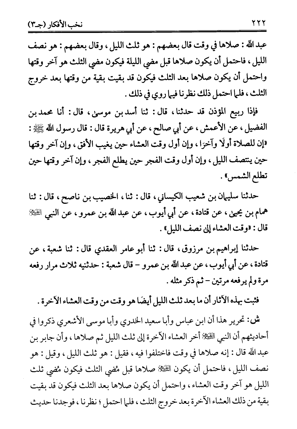 فثبت بهذه الآثار أن ما بعد ثلث الليل أيضًا هو وقت من وقت العشاء الآخرة.
