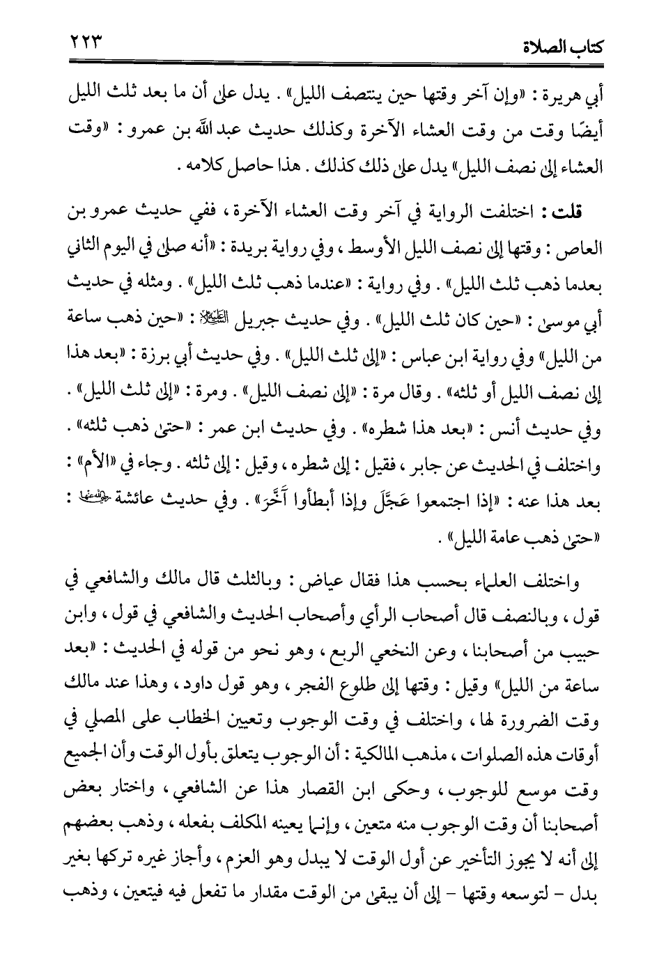 أبي هريرة: "وإن آخر وقتها حين ينتصف الليل". يدل على أن ما بعد ثلث الليل أيضًا وقت من وقت العشاء الآخرة وكذلك حديث عبد الله بن عمرو: "وقت العشاء إلى نصف الليل" يدل على ذلك كذلك. هذا حاصل كلامه.