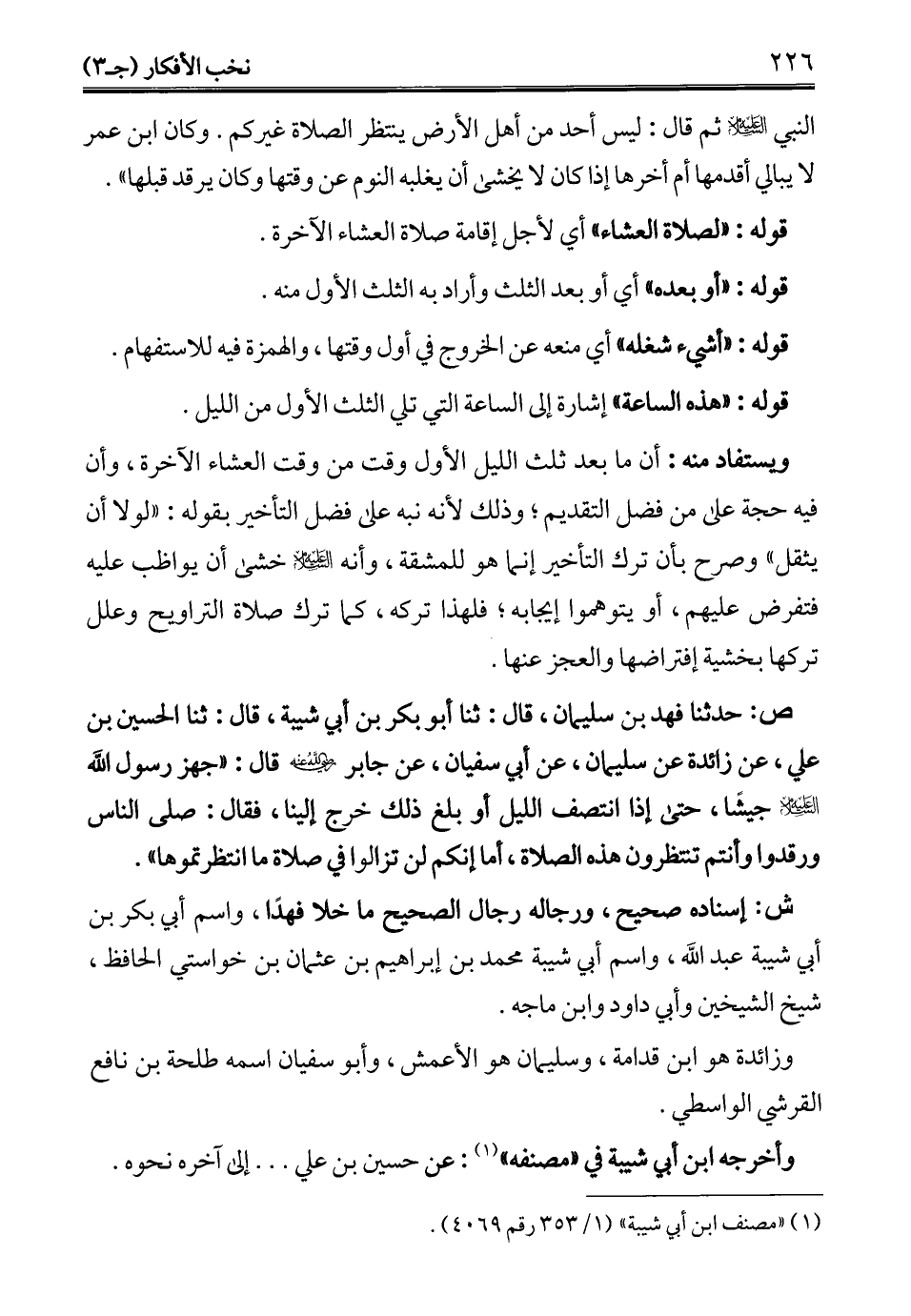 ص: حدثنا فهد بن سليمان، قال: ثنا أبو بكر بن أبي شيبة، قال: ثنا الحسين بن علي، عن زائدة عن سليمان، عن أبي سفيان، عن جابر - رضي الله عنه - قال: "جهز رسول الله - عليه السلام - جيشًا، حتى إذا انتصف الليل أو بلغ ذلك خرج إلينا، فقال: صلى الناس ورقدوا وأنتم تنتظرون هذه الصلاة، أما إنكم لن تزالوا في صلاة ما انتظرتموها".