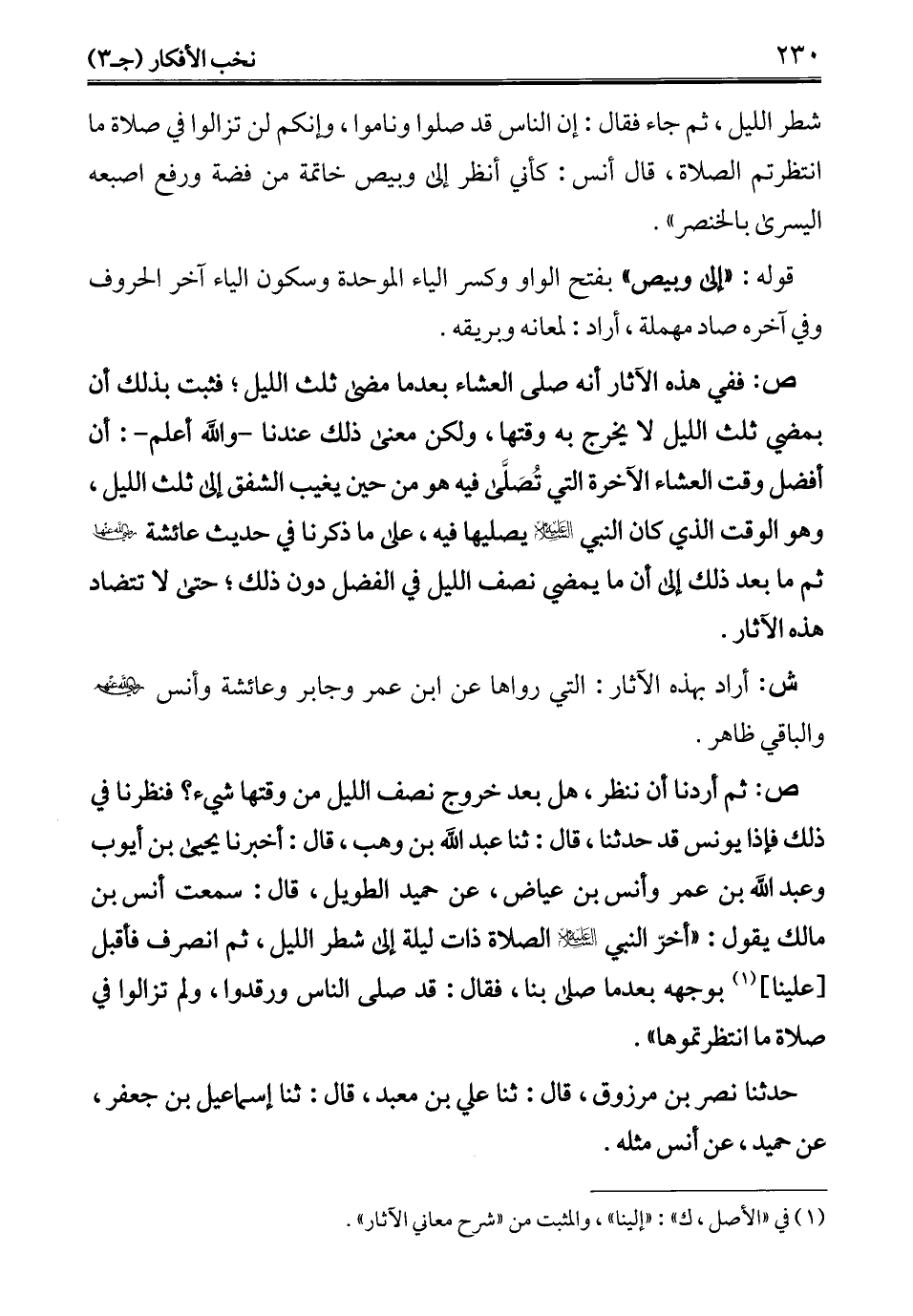 ص: ففي هذه الآثار أنه صلى العشاء بعد ما مضى ثلث الليل؛ فثبت بذلك أن بمضي ثلث الليل لا يخرج به وقتها، ولكن معنى ذلك عندنا -والله أعلم-: أن أفضل وقت العشاء الآخرة التي تُصَلَّى فيه هو من حين يغيب الشفق إلى ثلث الليل، وهو الوقت الذي كان النبي - عليه السلام - يصليها فيه، على ما ذكرنا في حديث عائشة - رضي الله عنها - ثم ما بعد ذلك إلى أن ما يمضي نصف الليل في الفضل دون ذلك؛ حتى لا تتضاد هذه الآثار.