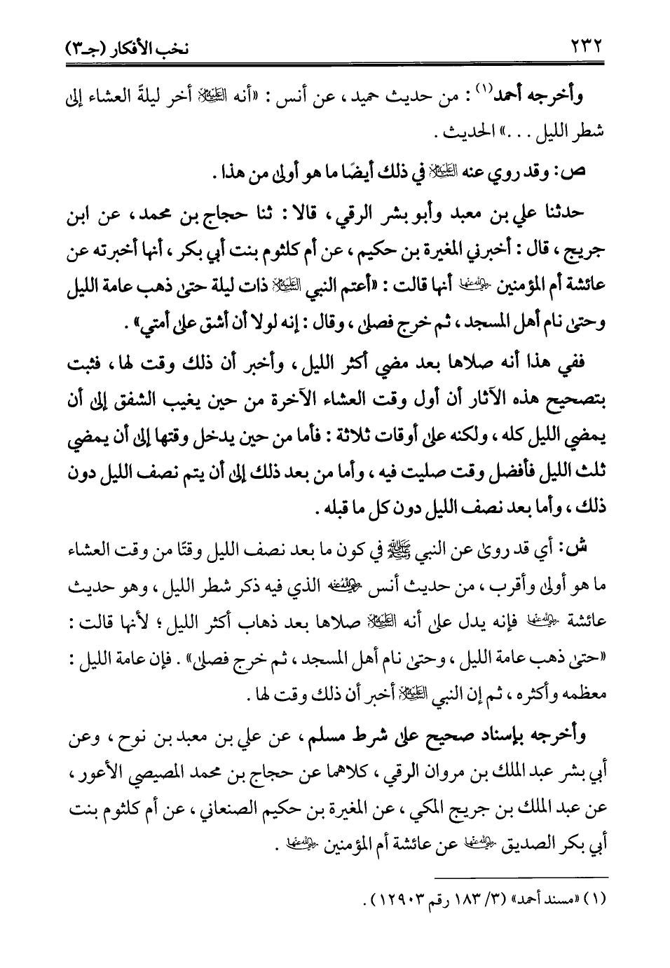 حدثنا علي بن معبد وأبو بشر الرقي، قالا: ثنا حجاج بن محمد، عن ابن جريج، قال: أخبرني المغيرة بن حكيم، عن أم كلثوم بنت أبي بكر، أنهما أخبرته عن عائشة أم المؤمنين - رضي الله عنها - أنهما قالت: "أعتم النبي - عليه السلام - ذات ليلة حتى ذهب عامة الليل وحتى نام أهل المسجد، ثم خرج فصلى، وقال: إنه لولا أن أشق على أمتي".